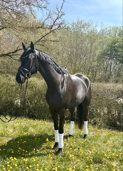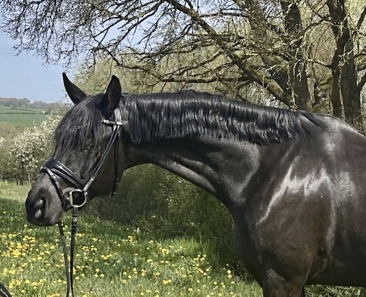 Michelangelo- ein wahres Ebenbild seines Vaters Morricone und ein echter Blickfang im Stall. Dieser elegante Rappe überzeugt nicht nur durch seine Optik, sondern auch durch seine inneren Werte. Er verfügt über drei sehr gute Grundgangarten, wobei besonders der raumgreifende Schritt und der ausdrucksstarke Galopp hervorzuheben sind– ideale Voraussetzungen für den Dressursport, aber auch für vielseitige Einsätze. „Michel“ wurde behutsam aufgezogen und altersgerecht angeritten (4Monate). Er kennt bereits Geländeritte, entspannte Spaziergänge sowie erste Stangenarbeit und zeigt sich dabei stets lernwillig und aufmerksam. Im Umgang ist er immer freundlich und ausgeglichen, er wartet jeden Tag auf „seinen Menschen“. Trotzdem ein Pferd mit „Geist“, das gefördert werden möchte und eine feine Hand zu schätzen weiß. Wir wünschen uns für diesen Charmeur einen einfühlsamen Reiter, der Freude daran hat, ihn weiter auszubilden und sein neuer Freund zu werden. Nur in liebevolle und passende Hände. Röntgenbilder ohne Befund liegen vor. P.S. Man muss ihn live gesehen haben!