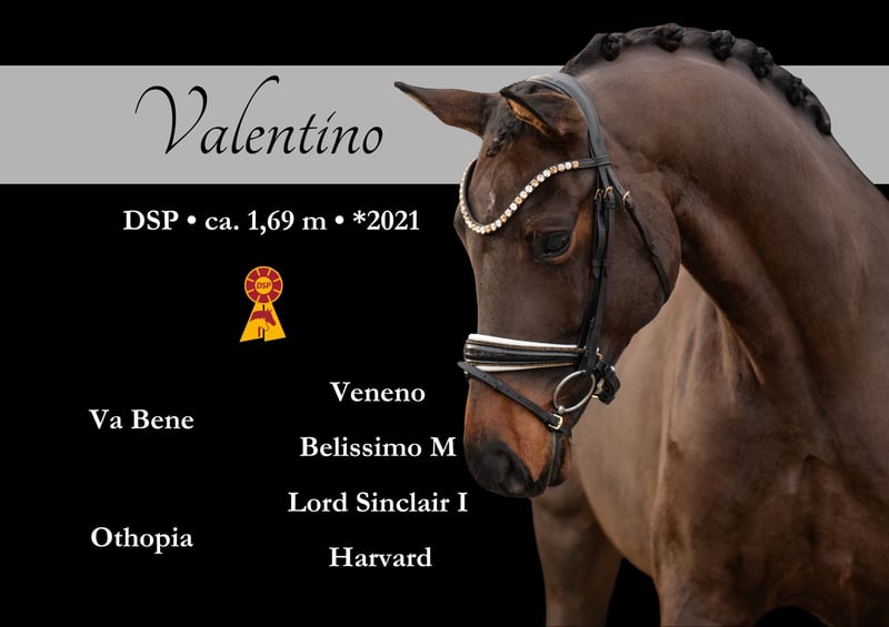 Liebe Interessenten, Für Terminvereinbarungen Probereiten senden Sie mir bitte eine WhatsApp. Für weitere Fragen bin ich tagsüber per WhatsApp erreichbar, telefonisch erreichen Sie mich am Besten zwischen 16 und 19 Uhr. Ich freue mich auf eine Kontaktaufnahme www.angelina-devittorio.de ⭐️Valentino⭐️ Alter: 5 Jahre (2021) Größe: ca 1,69 m Abstammung: Va Bene x Lord Sinclair I Ausbildungsstand: Reitpferde / DrPf A Niveau AKU: Gute Röntgenbilder vorhanden Zum Verkauf steht ein wunderschöner, vierjähriger Wallach von Va Bene, der mit überdurchschnittlicher Bewegungsqualität in allen drei Grundgangarten überzeugt. Super lieber Nachwuchstar mit tollem Charakter und Perspektive für das große Viereck ! Sein Galopp zeichnet sich durch eine hervorragende, bergauf springende Mechanik aus, im Trab präsentiert er sich elastisch, super taktsicher und schwungvoll, während er im Schritt durch Klarheit im Takt und sehr gutem Raumgriff besticht. Dabei zeigt er sich stets kooperativ, unerschrocken und von klarem Kopf. Trotz seiner absoluten Amateurtauglichkeit erfordert sein aktueller Ausbildungsstand noch etwas Jungpferdeerfahrung beim Reiter. Hier wächst ein Ausbildungspferd besonderer Güte heran, das alle Voraussetzungen für eine erfolgreiche Karriere auf dem großen Viereck mitbringt. ⚜️Tel: 0171-3438949 ⚜️a.devittorio@web.de ⚜️https://www.ehorses.de/angelinadevittorio Facebook und Instagram Angelina De Vittorio