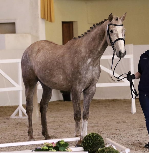 **Sales Advertisement: German Sport Horse - Gelding** For sale is a talented German Sport Horse gelding, born in 2020. This attractive grey stands at 162 cm and shows great potential in show jumping. Carlos impresses not only with his rideability and excellent work ethic but also with his balanced character. Currently placed up to show jumping A level. X-rays available. From the mother Alice by Askari, there are already 2 internationally successful offspring: Chico by Chap I, successful up to 1.45m in the USA, as well as Carina by Cellestial, successful up to 1.40m under Andre Thieme. If you are interested or have further questions, we look forward to your message!