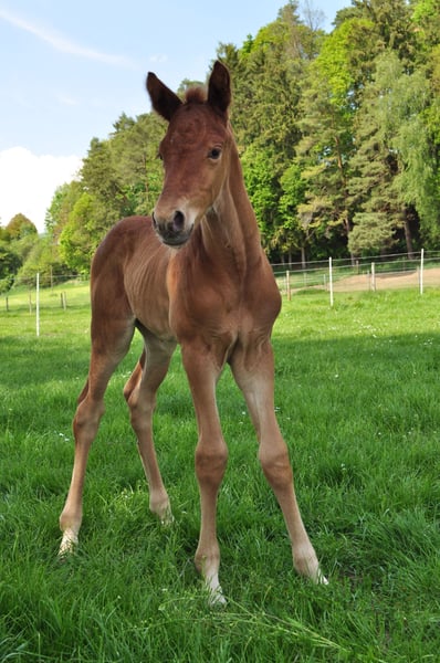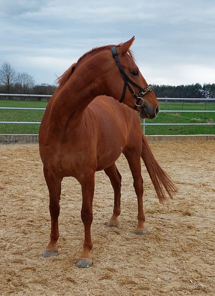 Name: Bossi (Bossa Malandro) Age: 6 years old Color: Dark Chestnut Height: Currently approximately 16.1 hh Training: Bossi has been in my possession since birth. He was backed at four years old and has always been in professional, horse-friendly training (full riding). He currently shows confidence at dressage horse class A level and is on the way to L* (for example, piaffe and passage already very secure). His three evenly good basic gaits (riding horse evaluation: 7.1, dressage horse class A: 7.28) and his lightness, seat comfort, and positive go make him an ideal partner for ambitious riders. With further training, he could also be used in M* level competitions. That was also my plan for him as a young horse. Temperament: In handling, Bossi is well-behaved, calm, and fearless — whether in the arena, on the riding ground, or in the field. Farrier, loading, competition routine, loading or waiting alone in the trailer are no problem for him. Additionally, he has a very people-oriented, affectionate character that brings joy every day. Bossi gets along well with other horses. So far, he shares a paddock with other geldings and is stabled in a box. Health: Bossi is clinically healthy and fully ready for riding and competition use. He has never been lame or seriously ill or injured. An up-to-date health certificate (AKU) with findings (chips: both hind legs left and right, medial and lateral) is available. I insured Bossi at three years old for surgery; this insurance can possibly be transferred. His regular, preventive care (e.g., dental, physiotherapy) is standard for me. Potential Uses: Bossi is versatile: he has potential in dressage, talent for jumping, and relaxed, confident cross-country riding — whether alone or in a group, at the front or behind. His dam, Dornröschen S (state premium mare), is successful in the competition sport: dressage L*/** (multiple wins) and M* placings. She has also competed in show jumping A level. Reason for selling: I am only selling Bossi because my professional circumstances are changing significantly. There is no rush, but I want him to find a home where he will be loved and where his qualities can continue to develop. Price: Reduced due to the findings on the X-ray. The price is negotiable; a suitable home is much more important to me. Getting to know Bossi: A trial ride is possible by appointment.
