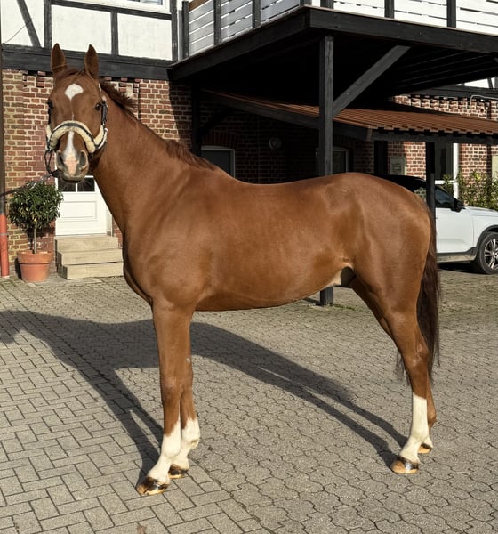 Versatile German Sport Horse for Sale For sale is an elegant and talented gelding, born in 2018. This beautiful chestnut impresses with his friendly nature and good rideability. He is a versatile sport horse and possesses all the qualities necessary for competitive riding. The gelding has limited experience in jumping but always strives to do his best. He learns quickly, approaches fences with confidence, and shows promising development. He is healthy and suitable for ambitious amateurs, as a family or children's horse, or for a competitive rider. If you are interested or have further questions, please feel free to contact us. A test ride can be arranged by appointment.