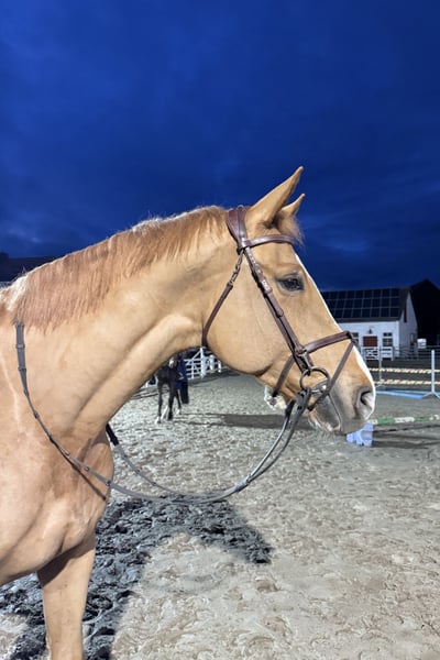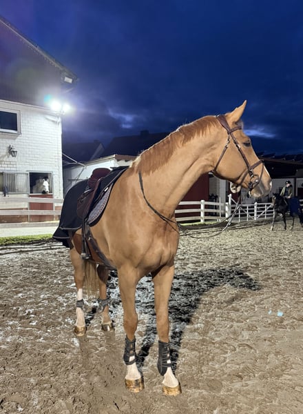 Maverick ist ein 7-jähriger Fuchswallach (Manchester van’t Paradijs x Landprinz) mit einem Stockmaß von 1,75 meinem liebenswerten Charakter und viel Qualität. Ein Pferd, das man von Anfang an ins Herz schließt. Er ist freundlich, aufmerksam und sehr menschenbezogen, dabei angenehm und unkompliziert im täglichen Umgang. Unter dem Sattel zeigt er sich ausgeglichen und immer auf der Seite seines Reiters. Er denkt mit, bleibt auch in neuer Umgebung gelassen. Maverick vermittelt seinem Reiter ein sicheres Gefühl – egal ob auf dem Platz, in fremder Halle oder im Gelände. Seine besondere Stärke liegt im Springen. Maverick ist bis M* platziert und konnte sich 2025 für das Bundeschampionat qualifizieren. Dort, wie auch im Training, zeigt er sich mutig, vorsichtig und sehr souverän am Sprung. Er bringt viel Qualität mit und ist dabei jederzeit rittig und gut zu regulieren. Trotz seines Vermögens wird Maverick im Parcours nicht heiß, sondern lässt sich auch im täglichen Training und zwischen den Sprüngen jederzeit ruhig und kontrolliert reiten. Er hat Einstellung und vermittelt Sicherheit. Damit eignet er sich ideal für einen Reiter, der sich im Springen weiterentwickeln und im A- bis L-Bereich erfolgreich auf Turnier unterwegs sein möchte oder auch für einen ambitionierten Pony-Umsteiger ist er gut vorstellbar. Dressurmäßig wird Maverick ebenfalls gefördert und befindet sich auf einem guten A- bis soliden L-Niveau. Maverick ist schmiede- und verladefromm, regelmäßig geimpft und entwurmt. Aktuelle Röntgenbilder liegen vor und können bei ernsthaftem Interesse gerne eingesehen werden. Der Verkauf erfolgt im Auftrag des Besitzers. Da im Stall junge Pferde nachrücken und die Plätze begrenzt sind, wird Maverick aus Bestandsgründen abgegeben. Wir wünschen uns für ihn ein passendes Zuhause, in dem er weiter gefördert und wertgeschätzt wird.