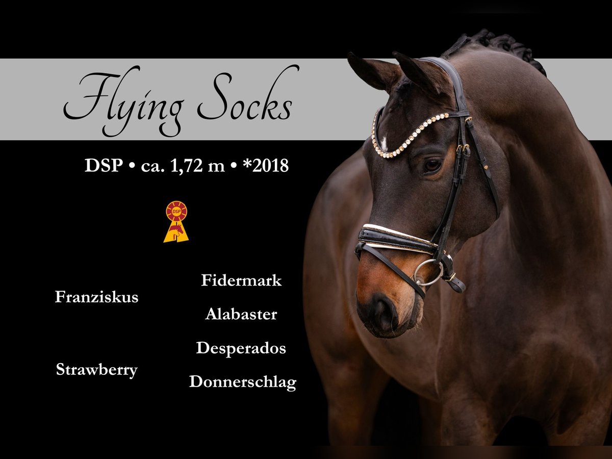 Dear Interested Parties, To schedule a test ride, please send me a WhatsApp message. For further questions, I am available during the day via WhatsApp, and you can reach me best by phone between 4 pm and 7 pm. I look forward to hearing from you. www.angelina-devittorio.de ⭐️Flying Socks⭐️ Age: 8 years (2018) Height: approximately 16.1 hh Pedigree: Franziskus x Desperados Training level: M-level, DrPf L high placement X-ray examination: Good radiographs available Location: 87549 Rettenberg This 8-year-old gelding by Franziskus x Desperados impresses with outstanding quality, exceptional expression, and remarkable elasticity. He has a modern type and offers excellent potential and prospects for the grand Prix ring. His movements are characterized by natural swing, suppleness, and expressive power, making him a true eye-catcher. The gelding has achieved high placements in dressage competitions at class L and is currently confidently competing at M-level dressage. He has been consistently and gently trained in amateur ownership since his fourth year of life and comes directly from the breeder. He has always been kept correctly, regularly vaccinated, dewormed, presented to the farrier, and has never been ill. In daily handling, he is well-behaved, uncomplicated, and reliable. Both in training and at competitions, he is an absolute treasure, confidently handling off-site training and impressing with his presence and joy in attention on the competition arena. Under saddle, he is always highly motivated, performance-ready, and works honestly. He is absolutely suitable for amateurs but is not sold to inexperienced riders. Due to his exceptional quality, he requires a rider with at least L-level skills. He is never mean but needs a consistent, finely riding rider who knows how to correctly interpret his abilities. He is familiar with varied training methods such as double longeing and cavaletti work. He needs some ground support when jumping, as this is not his strongest discipline. In the terrain, he is completely reliable—whether alone or in a group, even at a canter side-by-side, he remains controllable. He is well-acquainted with road traffic, environmental stimuli, and water. The gelding is very social, has always been part of a herd here, and gets along well with other horses, especially geldings. He enjoys playing and actively seeks out companionship. He visibly enjoys and benefits from daily turnout on pasture or paddock. He is accustomed to trailer loading, approaches the trailer willingly and patiently, even when other horses are unloaded first. This special horse is only sold to a knowledgeable owner who provides several hours of turnout daily.