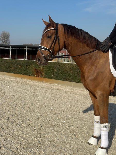 Hannoverian gelding, born in 2023, chestnut, with a height of 16.1 hh – a promising young talent for dressage. This charming chestnut impresses with his elegant appearance and solid foundation. He has already been well-started under saddle and is extremely friendly and eager to learn in handling. Thanks to his balanced temperament and good basic training, he is ideally suited for an ambitious dressage rider who values a strong foundation. With his modern look and potential, this Hannoverian gelding is an excellent investment for a future career in dressage. We look forward to hearing from interested parties.