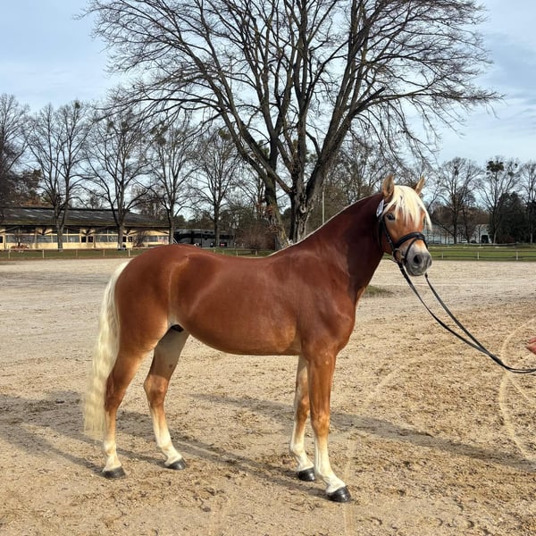 Typvoll aufgemachter Edelbluthaflingerhengst mit sehr guten Grundgangarten. Der Hengst wurde in München-Riem süddeutsch gekört. Er ist schmiede und verladefromm und sehr umgänglich.