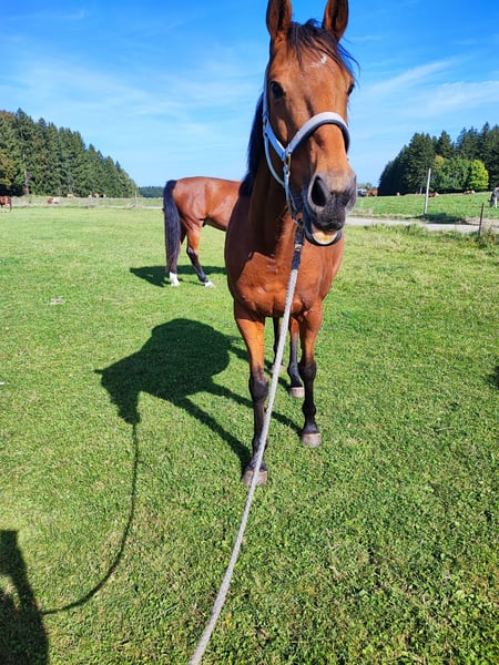Wir suchen ein neues Zuhause für unsere englische Vollblutstute Bailey, geb 2014, ca. 1,65m. Bailey ist nicht einfach nur ein Pferd, sie ist eine echte Persönlichkeit und ein absolutes Herzenspferd für "ihren" Menschen. Was sie besonders auszeichnet, ist ihr toller Charakter. Sie ist extrem menschenbezogen, sucht immer den Kontakt und möchte ihrem Partner Mensch gefallen. Wer eine tiefe Bindung sucht, wird sie in ihr finden. Bei Unbekannten kann sie auch mal "Fremdeln", wen sie kennt und mag, dem wendet sie sich zu. Zudem ist sie sehr intelligent und liebt es, geistig gefordert zu werden – Bodenarbeit und das Lernen von Tricks bereitet ihr riesige Freude und sie begreift Neues oft in Rekordzeit. Im Gelände ist sie eine treue Begleiterin und geht sehr gerne raus. Wenn sie alleine unterwegs ist, zeigt sie sich von ihrer vorsichtigen Seite und orientiert sich an der Sicherheit ihres Reiters. Gemeinsam mit anderen Pferden oder geführt ist das aber gar kein Problem. Bailey ist ein besonderes Pferd für jemanden, der keinen „Sportartikel“, sondern einen Freund fürs Leben sucht. Bailey ist bei uns Voltigierpferd. Auch im Umgang mit den Kindern ist sie sehr liebevoll und vorsichtig. Allerdings würde ich sie keines falls als "Kinderpferd" sehen. Das eine oder andere Mal kommt das Vollblut raus und wenn ihre Bezugsperson unsicher ist oder wird, wird sie auch unsicher. Bailey hat sich letztes Jahr nach einer schweren Hufentzündung das Strahlbein gebrochen und kann daher nicht mehr leistungsorientiert im Voltigiersport eingesetzt werden- was ihr Job bei uns im Verein sein sollte. Die Besonderheit bei einem Strahlbeinbruch ist, dass der Knochen von Gelenkflüssigkeit umspült wird und daher sehr schlecht heilt. Bailey geht es aber gut. Sie ist lahmfrei ohne Medikamente und kann problemlos mit der Herde auf die Koppel. Da der unvollständig geheilte Knochen ein Risiko für eine spätere Sehnenverletzung darstellt, muss sie sehr vorsichtig belastet werden. Wir machen jetzt seid einigen Wochen Reha-Training mit ihr. 2-3 x die Woche 15-20 Min traben an der Longe, Bodenarbeit und Spaziergänge. Einmal die Woche wird kurz im Schritt voltigiert. Unter dieser Art von "Belastung" ist sie stabil. Bailey ist das richtige Pferd für dich, wenn du dir mehr eine Beziehung zu einem Lebewesen wünscht als einen Partner für Sport. Klassisch Reiten, im Sinne von 1h Dressur auf dem Platz, knackige Ausritte oder sogar Springen sollte man mit ihr nicht mehr machen, auch wenn sie nicht lahm ist- einfach damit das so bleibt. Wir wünschen uns einen Menschen, der Baileys Wohlergehen an erster Stelle sieht und sich mit ihr und ihrem Krankheitsbild auseinandersetzen möchte. Wir sind ganz transparent damit und ernsthafte Interessenten können gerne mit unseren Tierärzten sprechen und alle Befunde einsehen. Neben der Vorsicht sie nicht zu überlasten, muss man bei Bailey aber ansonsten nichts beachten. Sie verträgt 24/7 ad libido Heu (ja, wenn sie nichts tut wird sie etwas füllig dabei, aber sie bekommt keine Stoffwechselprobleme), sie braucht keine regelmässigen Medikamnet oder tierärztlichen Behandlungen. Wir füttern ihr hochwertiges Zusatzfutter und sind überzeugt, dass das sehr zu ihren Fortschritten beigetragen hat. In der Herde ist sie unkompliziert, weder rangoch noch besonders rangniedrig. Wir wünschen uns für Bailey Offenstallhaltung und eine möglichst stabile Herdenzusammenstellung. Sie wird Beginn zur Verfügung abgegeben, wenn alle zufrieden sind und man sieht,dass es gut passt, kann eine Übergabe mit Schutzvertrag erfolgen. Wenn du aus dem Umkreis kommst ( max. 100-150km von Dießen) und Bailey dein Interesse geweckt hat, melde dich gerne bei uns! Wir würden uns sehr freuen, wenn du dich kurz vorstellst und uns verrätst, warum dich Bailey anspricht und wie du dir eine Zukunft mit ihr vorstellst. "Letzer Preis" oder ähnliches wird nicht beantwortet. Es kann sich jeder Vorstellen, dass wir jetzt nicht viel Geld für Bailey haben möchten- tatsächlich hat ihr Wohlergehen und ein guter Platz unsere absolute Priorität. Wir finden Preisverhandlungen vor dem Kennen lernen aber ein Nogo. Wenn es dir auf 200€ hin oder her wirklich ankommt, dann solltest du dir kein Pferd zulegen- in Realtion zu dem was ein Pferd an laufenden Kosten produziert, sollte das nicht ins Gewicht fallen.