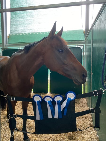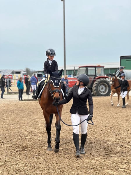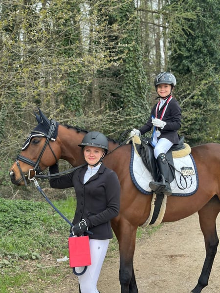 Ucella is an adorable, honest mare with plenty of energy, yet always easy to handle. Over the past year and this year, she has accumulated numerous ribbons in E and A jumping competitions with a young, minor rider and even competed in her first lead-rein class with a small girl. Of course, she also earned a ribbon there. She always wants to please! Our main focus has been on jumping. We often say she has "eight feet" because she is very quick and strives to avoid mistakes. There is definitely potential for more, which she has already demonstrated several times during training. She is familiar with free jumping, ground work, and calmness training, and has been ridden with a halter. She is also unfazed by children and dogs jumping around her. As is typical for a Thoroughbred, she is quite sensitive and highly attuned to her rider’s mood. Therefore, an experienced rider who can provide her with confidence would be ideal. Currently, she is in a herd of three mares and has a lower ranking in her group. She is shod in front and handles this very well. I am looking for someone to keep her engaged in a variety of activities. She is suitable for a younger rider who wants to learn and grow with her, as well as for an experienced rider. She could also be interesting for eventing, although she has not yet gained experience in that discipline. She will only be sold into the best hands! Location: Oberding, 85445 For inquiries, please contact: 0176-24989677 Videos will be available soon.