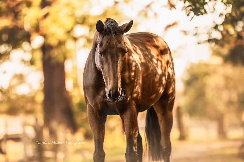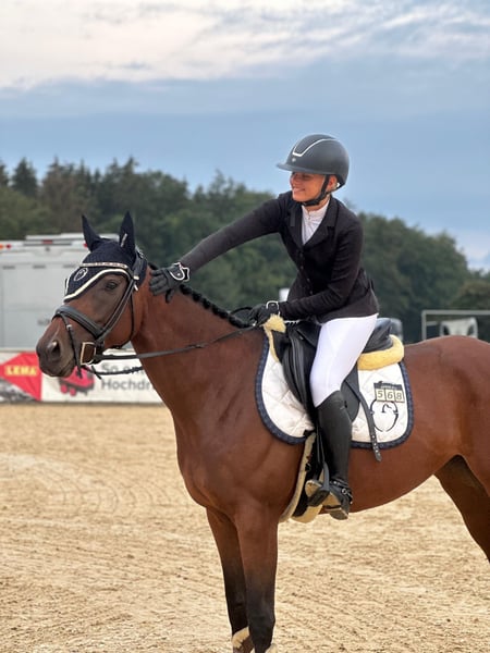 Ucella es una yegua muy dulce y honesta, que posee mucho carácter y energía, pero siempre es muy manejable. Este año y el anterior, ha obtenido varias vueltas en saltos de nivel E y A junto a una joven amazona menor de edad, y también participó en su primera clase de iniciación con una niña pequeña, donde, por supuesto, ganó un lazo. ¡Siempre quiere agradar! Nuestro enfoque principal ha sido el salto. “8 patas”, decimos siempre, porque es realmente muy rápida y no quiere cometer errores. Sin duda, tiene potencial para más, como ya nos ha demostrado varias veces en entrenamiento. Sabe hacer saltos libres y trabajo en tierra, así como entrenamiento de calma, y también ha sido montada con cabezal de cuerda. Los niños y perros que saltan alrededor de ella no le molestan en absoluto. Por su carácter, típico de un pura sangre, es algo sensible y se adapta mucho a la temperamento de su jinete, por lo que sería ideal un jinete que ya tenga cierta experiencia y le pueda dar seguridad. Actualmente, está en un grupo de yeguas de nivel 3 y, por su carácter, ocupa una posición baja en la jerarquía. Lleva herraduras en las patas delanteras y se lleva muy bien con ellas. Busco para Ucella a alguien que la ocupe en diferentes disciplinas. Es adecuada tanto para un jinete joven que quiera aprender junto a su caballo, como para uno más experimentado. También sería interesante para la modalidad de concurso completo, aunque aún no ha tenido experiencia en ella. ¡Se vende solo a las mejores manos! Ubicación: Oberding, 85445 Para interés, por favor, contacta al: 0176-24989677 Videos próximamente.