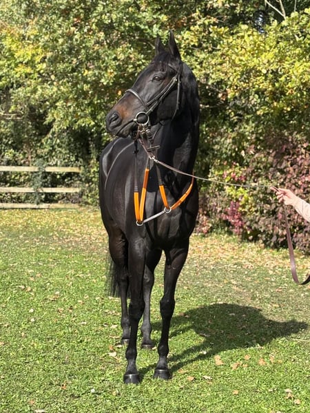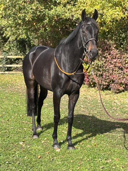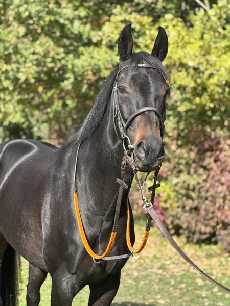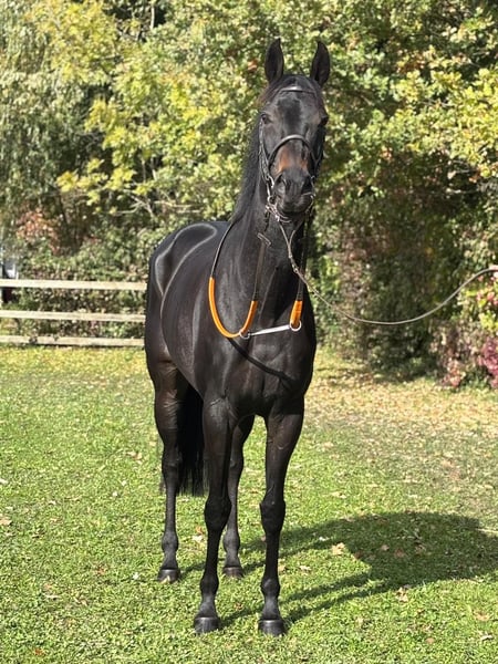 Albany is a very harmonious, nearly black English Thoroughbred mare. She has achieved two wins and placed eight times during her racing career. Due to a tendon injury, she was retired this season and has been at stud since then. She is sound in walk and trot, is exercised daily in a lunging session, and is turned out in a herd.