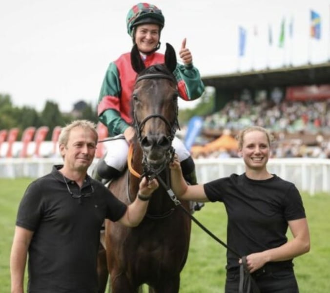 Albany ist eine sehr harmonische, fast schwarze, englische VB-Stute. Sie hat in Ihrer Rennlaufbahn zwei Siege eingelaufen und war 8mal platziert. Aufgrund einer Sehnenverletzung wurde sie diese Saison retired, ist seitdem im Gestüt. Sie ist im Schritt und Trab lahmheitsfrei, wird täglich in der Führmaschine bewegt und hat Koppelgang in Herde.