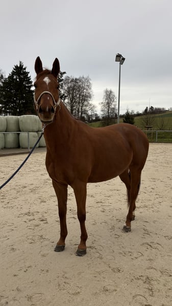 Unsere Stute Käthe sucht ein neues Zuhause. Sie wurde bei uns im Reitunterricht sowie in den Anfängen des Voltigier-Unterrichts eingesetzt und zeigt sich verlässlich im Umgang. Käthe hatte einen Fesselträgerschaden, der eine Phase der Boxenruhe nötig machte. Aktuell ist sie ggr. lahm und momentan nicht antrainiert, weshalb sie nur bedingt reitbar ist. Als Beistellerin oder Zuchtstute eignet sie sich jedoch sehr gut. Zurzeit lebt sie im Offenstall in einer kleinen Stutenherde, kennt aber ebenso Boxenhaltung mit Weide und Paddock.