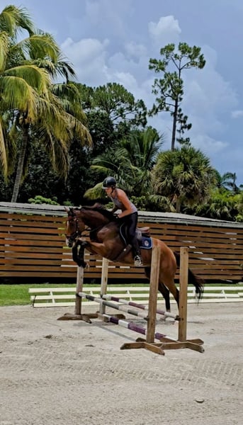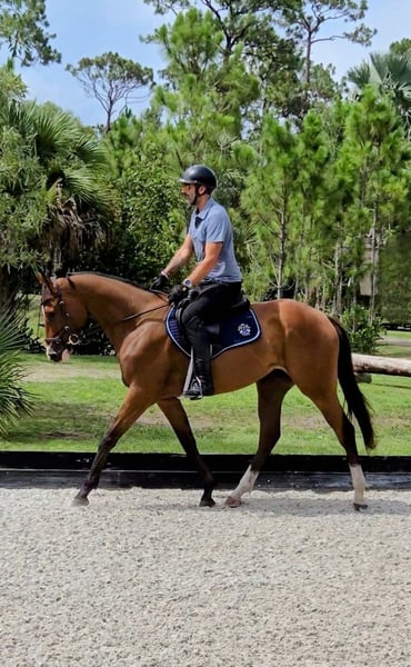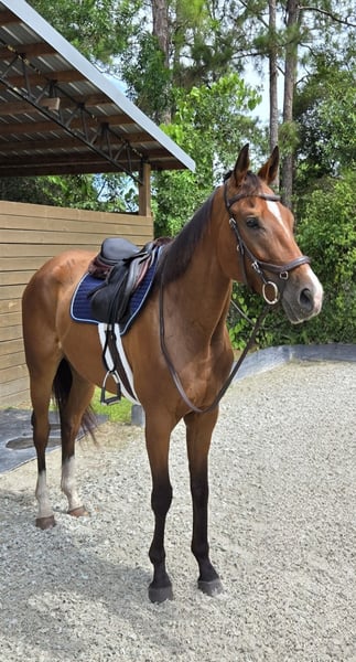 Super talented 4 yo 16'2 ottb gelding located in the Loxahatchee/ wellington Florida area. Videos: https://youtu.be/AwI3NMbSny0 This exceptional baby will make someone lucky! Clean legs, no injury, flashy with no vice. Load well, stand at the cross ties, good feet ( front shoes only). UTD on everything ( vax, coggins, dentist, deworming...) This horse has been professionally trained for 3 months after the track and did his first starter schooling show in September. Beautiful mover, sensitive, smart, classy jump form, super careful jumper with a steady rhythm ( will excell in the hunter ring), very athletic and happy to trail ride with a buddy. This horse is still super young so I would prefere him to stay with an experienced rider. I would also like him to live with one or several horses, he is a sweet heart who loves playing with his other horse friends and have interaction, otherwise he will be sad and anxious. Not a horse who will live alone in a stall all day long for sure. He can be a bit marish with his ground manners ( he is still super young, has been traited and tested for ulcers and is all clean) but what a gem of a horse he is under the saddle and a true steal ! Mid fours. https://youtu.be/AwI3NMbSny0 https://www.equibase.com/profiles/Results.cfm?type=Horse&refno=10954348®istry=T&rbt=TB