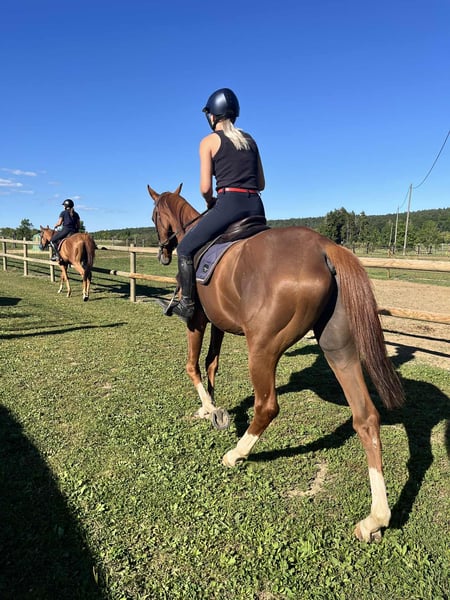 Klacz, PS, urodzona 27.04.2021, 167 cm Łagodna i przyjazna dla człowieka Świetnie sprawdza się na zewnątrz, jest elastyczna i ma bardzo piękne chody Szanuje ogrodzenia, jest towarzyska wobec innych koni Posłuszna na uwięzi, podczas czyszczenia Jeżdżona w halterze Dobrze znosi załadunek i podróż w przyczepie lub ciężarówce Szczepienia, odrobaczenie, kowal, dentysta we wrześniu 2025, akupunktura 2025, osteopatia 2025, książeczka zdrowia i dokumenty Stajnia, boks, padok G3/4