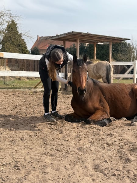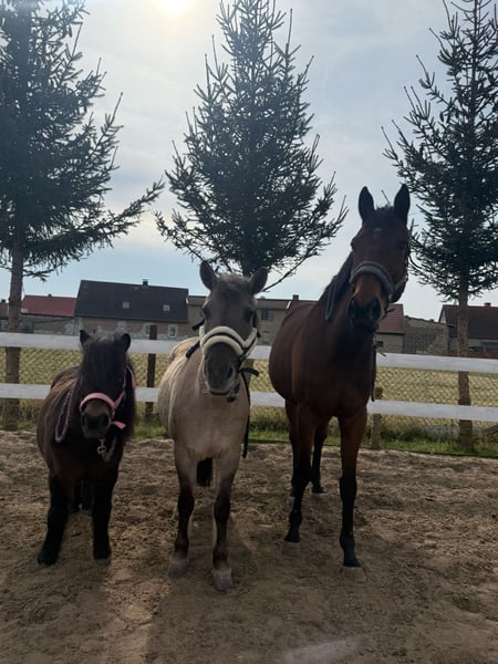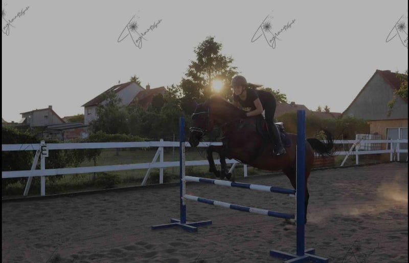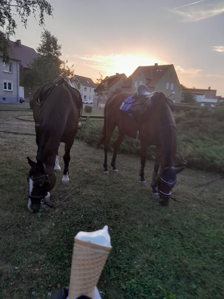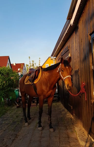 Zum Verkauf steht mein 8 jähriger Wallach Diarrigo. Er hat ein Stockmaß von ca. 162 cm. Er ist ein sehr freundliches, aufmerksames und zugewandtes Pferd, das nun auf der Suche nach einem Menschen ist, der sich täglich mit ihm beschäftigt und bei dem er im Mittelpunkt stehen darf. Diarrigo wurde die letzten Jahre hauptsächlich freizeitmäßig von einer Jugendlichen geritten und gesprungen. Er ist sehr fein zu reiten und befindet sich im Pacour auf guten A Niveau einzelne Sprünge auch L-M Niveau. Seines Potentials ist die Dressurarbeit definitiv nicht seine Leidenschaft, weswegen er auch nicht als Dressurpferd, sondern wirklich als Freizeitpferd-/Springpferd bzw. Allrounder verkauft wird. Er macht nämlich auch einen Tollen Job als Anfänger/Kinderpferd durch seine Ruhige Art beeindruckt er jedes kleines Kind! Er ist kein Gewichtsträger. Am liebsten wäre uns eine Person, die wirklich hauptsächlich ins Gelände gehen mag und sich dabei auf ein Pferd freut, das immer genug Power hat. Er kennt es auch Baumstämme im Gelände aus den unmöglichsten Winkeln zu springen und ist ein richtiges Spaßmobil wenn man springen mag;). Er wird als Wiedereinsteiger-/Anfänger-/Kinderpferd verkauft! Er kennt Boxenhaltung und Offenstallhaltung. Er hat keine Allergien. Er ist nicht beschlagen und läuft schon immer Barhuf. Er hat immer alle Impfungen bekommen und wurde regelmäßig entwurmt. Wir wünschen uns wirklich ein schönes, wertschätzendes Zuhause für ihn, das ist uns sehr wichtig. Wenn ihr das Gefühl habt, dass er zu euch passen könnte, dann kontaktiert uns sehr gerne und wir können einfach mal quatschen und schauen ob es passt, bzw. Fragen jeglicher Art klären. Videos aus dem Alltag sind vorhanden. Preis ist mit Zubehör würde ihn aber auch ohne abgeben. WhatsApp/Handy: 01512 0035349