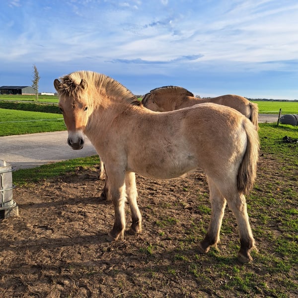 Beautiful colt foal born on June 15, 2025. His father is Lasko 'd Ober and his mother is Novalinda. At the inspection, he achieved a nice A premium. He is microchipped and registered in the Dutch Fjord Horse Studbook. Always trimmed on time, vaccinated, and dewormed. He is familiar with the trailer, stands well, and receives foal feed daily. He is growing up together with a filly. For pedigree; see document! He can move to a new home starting mid-November!