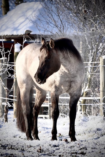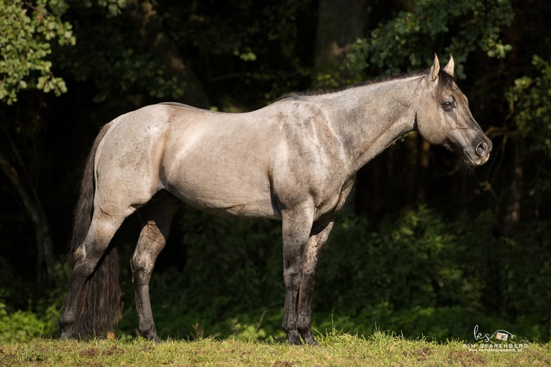 FLAMBOYANT QUIXOTE comes from proven AQHA Ranch Horse lines (Foundation Share FQHA 98%). It is the successful result of 40 years of breeding experience! His breeders in Montana are known for their beautiful horses with a very amiable character and easy training. Their horses have proven themselves for decades in all imaginable disciplines, as well as in ranch work and as family horses. Flamboyant also has a good-natured character and is good to ride by weaker riders. It is equipped with a proper building, strong muscle, strong foundation, hard black hooves and a adorable head. On top it has a very exclusive color: Grullo Roan and is homozygous for black. Flamboyant is THE stallion for those who appreciate the original qualities of the Quarter Horses: versatility, nerve strength, race-typical appearance AND athleticism! 5 panels n/n Cover tax: 750 euros (early booking discount 10%) Fresh seeds, refrigerated seeds and frozen seeds are available. Cover tax plus side food of the deck station (approx. 135 Euro incl. shipping) It is approved for quarter, paint mares Lots of more information, pictures and videos on our website or under his name on FB