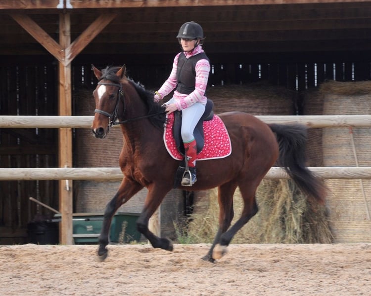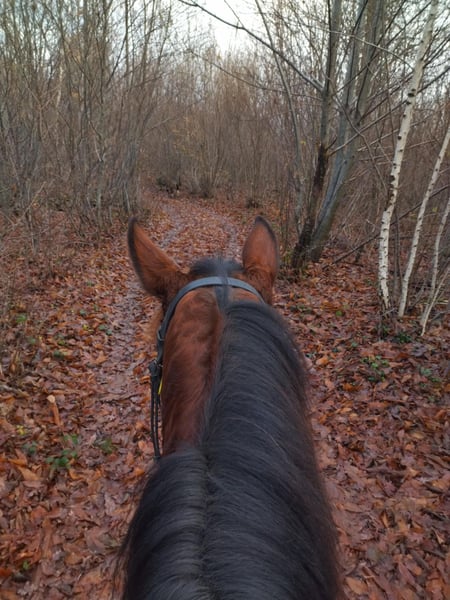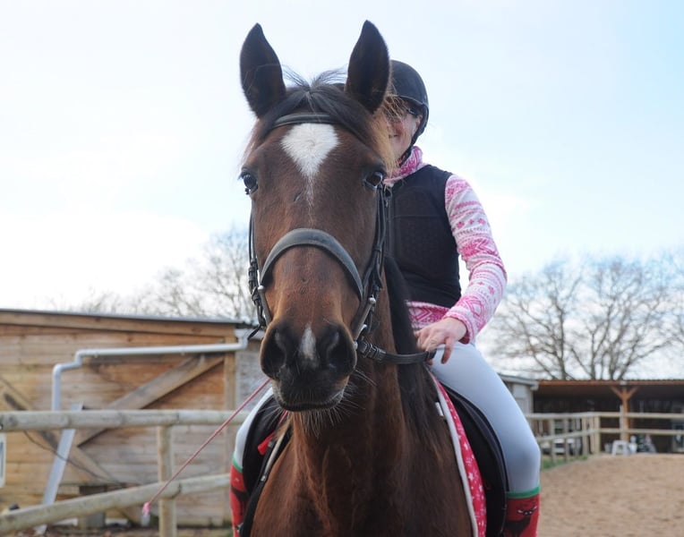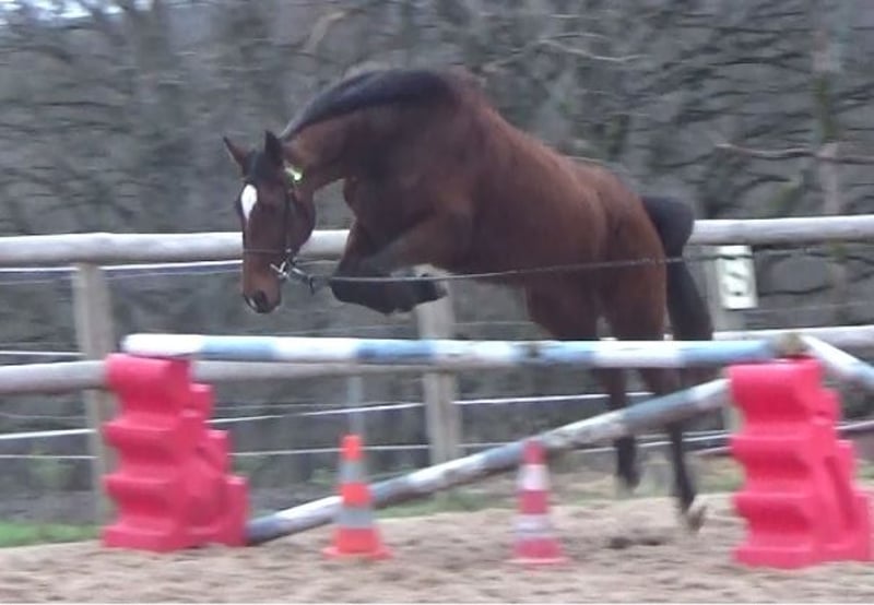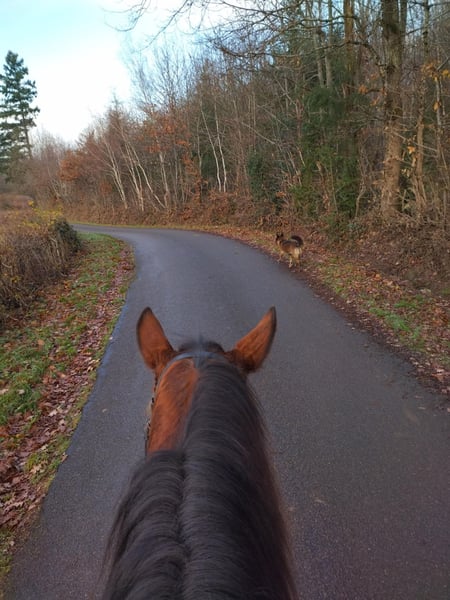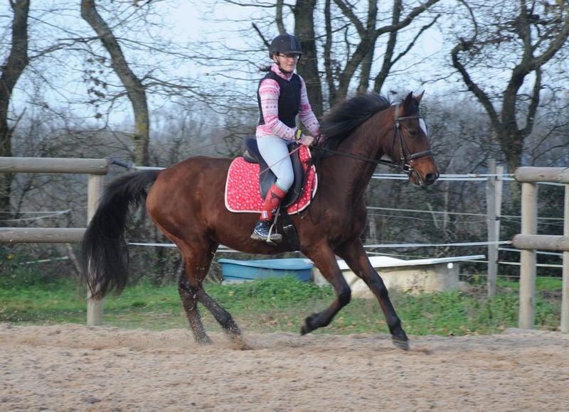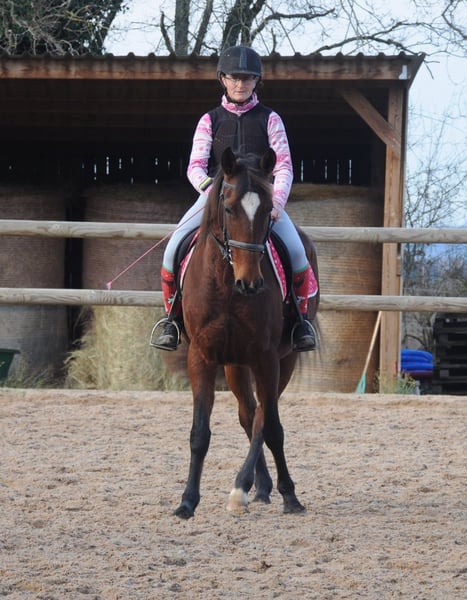 Flashdance Sallaz Trotteur français Jument 11 ans 1m55 Flashdance a un passé un peu flou, elle n'a jamais couru, elle a certainement été essayée à l'entraînement dans ses jeunes années sans résultat, et elle a été utilisée comme mère porteuse ces dernières années, elle aurait eu un poulain. Elle est arrivée craintive de toute manipulation, un très gros travail à pied a été nécessaire et elle a bénéficié d'un partenariat en shiatsu, ce qui l'a également beaucoup aidée. Elle s'est progressivement détendue jusqu'à devenir une adorable jument proche de l'homme, elle a appris à avoir confiance en nous et en elle. Elle a maintenant de bonnes bases en dressage et s'avère plaisante sous la selle. Elle ne bouge pas au montoir et reste calme à l'arrêt, elle a les déplacements latéraux au pas (épaule en dedans et cession à la jambe), les départs au galop sont bien acquis et elle galope en équilibre aux deux mains, avec un très bon galop. Elle ne s'appuie pas, ne chauffe pas, elle est calme tout en ayant l'énergie suffisante pour être agréable. Elle n'est pas travaillée montée à l'obstacle pour l'instant, elle saute facilement 90 cm en longe. Elle sort seule en extérieur, elle y est à l'aise et tout aussi agréable qu'en carrière, elle fera une très bonne jument de balades et même de rando car elle est allante et plutôt porteuse, avec de bons pieds. Elle connaît les voitures et les chiens qui ne lui posent aucun problème. Flashdance est une jument que j'apprécie beaucoup, expressive, intelligente, avec une vraie personnalité. Elle peut correspondre à des cavaliers à partir d'un niveau galop 4. Elle est à jour de parage et vermifuge. Flashdance est visible à Saint-Romain-sous-Gourdon (71230) en Saône et Loire