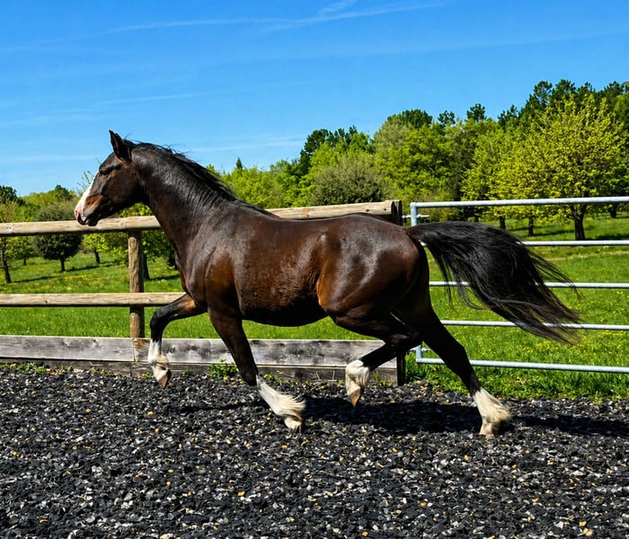 Poney de dressage à vendre – Entier PFS 2024 – RM Most Beautifulboy x Volupto des Bourdons – Avenir sport dressage Opera Rock Bel’Air est un poney Français de Selle de 2 ans, toisant actuellement environ 1,45 m. Il présente un modèle très harmonieux, moderne et bien proportionné, avec une vraie orientation vers le sport et particulièrement le dressage. Issu du remarquable RM Most Beautifulboy (DRP), étalon performer et reconnu pour la qualité de sa production (Champion de France à 5 et 6 ans, noté jusqu’à 85,2 %, approuvé et primé en Allemagne, avec des notes exceptionnelles jusqu’à 97/100 en modèle et allures), Opera bénéficie d’une génétique particulièrement valorisante. Sa lignée maternelle renforce cet héritage avec Volupto des Bourdons, poney performant et régulièrement classé jusqu’en Amateur 1 dressage. Il est reconnu pour transmettre des qualités essentielles pour le sport : un mental stable, de la disponibilité sous la selle et une vraie facilité d’utilisation. Cette souche maternelle apporte également de la solidité dans le modèle ainsi qu’une bonne aptitude à l’apprentissage, faisant d’Opera un poney particulièrement intéressant pour une évolution progressive et sécurisante. Opera se distingue déjà par trois très bonnes allures, amples, élastiques et bien cadencées, laissant entrevoir un réel potentiel pour le dressage de haut niveau poney. Encore très jeune, il n’a pas encore été mis au travail sous la selle, ce qui offre la possibilité de construire son évolution dans le respect total de sa croissance et selon un projet sur mesure. Tempérament & quotidien Opera présente un mental particulièrement intéressant pour son âge : Calme et équilibré Très proche de l’homme Joueur et curieux Peu émotif, avec un tempérament facile Il est agréable à manipuler au quotidien : Facile aux soins Bien éduqué pour son âge Bon comportement général Pour quel projet ? Opera Rock Bel’Air conviendra particulièrement : à un cavalier jeune ou encadré souhaitant former un poney d’avenir à un projet orienté dressage avec objectif de valorisation sportive à un professionnel ou amateur ambitieux recherchant un poney de qualité à construire à un projet visant le haut niveau poney à moyen / long terme Ses points forts Origines d’exception : RM Most Beautifulboy x Volupto des Bourdons Production issue de lignées performantes et reconnues Trois allures de qualité : amplitude, élasticité, équilibre Modèle moderne et harmonieux Mental facile, proche de l’homme et peu émotif Jeune poney à construire, offrant un fort potentiel de valorisation