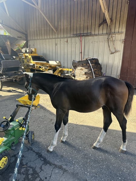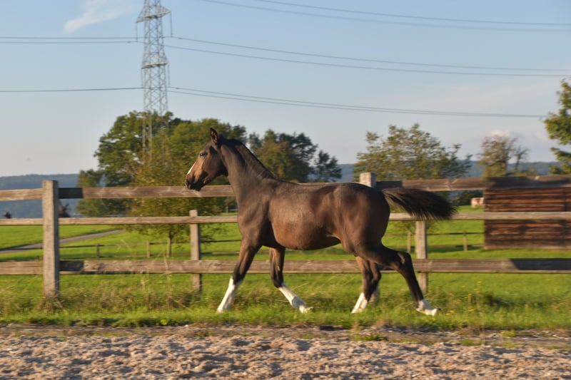 Hengstfohlen FM von Hayden / MV: Vartan, - Pferdezuchtgenossenschaft Birstal. Geboren ist er am 20.04.2025. Er hat gute Gänge, ist menschenbezogen, ist verladefromm, ist es gewohnt angebunden zu sein, ist Kinder gewöhnt, kommt mit ins Gelände, kennt den Verkehr - also Fahrzeuge, Baustellen, verschiedene Untergründe und Geräusche. Helios wurde als zweites Fohlen unserer Nanda geboren. Umgang mit anderen Pferden ist er gewohnt. Er ist lebhaft und verspielt, wird aber auch gern gekuschelt und gestreichelt. Auch bei kleinen Kindern war er bisher immer brav und freundlich. Unser Hof liegt mitten im Dorf, daher ist er jeglichen Verkehr gewöhnt. Wir gehen aber auch zusammen mit seiner Mami mit ihm ins Gelände. Das kleine Fohlen-ABC beherrscht er - Hufe auskratzen, halftern, putzen, abspritzen, decken etc. ist problemlos möglich. Er ist je nach Bild etwas heller bzw dünkler und wird momentan eher etwas dünkler. Unser Helios ist ein hübsches und aufmerksames Fohlen und wünscht sich einen tollen Platz bei lieben Menschen. Verfügbar ist er ab Mitte Oktober 2025, mit Pass.