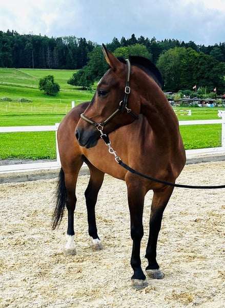 LENA Lena est une jument Fribourgeoise de 3 ans, aimable, jolie, bien proportionnée et au caractère fort, avec beaucoup de potentiel. Elle se distingue par son caractère doux et obéissant ainsi qu'un extérieur correct. Actuellement, elle mesure environ 150 cm au garrot – délicate, mais avec charme et présence. La jeune dame se montre désireuse d'apprendre, sociable et fiable, en particulier en extérieur. Elle connaît le maréchal-ferrant, est actuellement ferrée aux quatre fers et a déjà été introduite avec soin dans les cours d'équitation, où elle a travaillé avec assiduité et attention. Pour Lena, nous souhaitons une personne expérimentée et patiente, qui prendra plaisir à poursuivre sa formation depuis le sol et plus tard également sous la selle. Elle a les meilleures conditions pour devenir une partenaire de loisir fiable – avec du temps, du calme et un accompagnement cohérent.