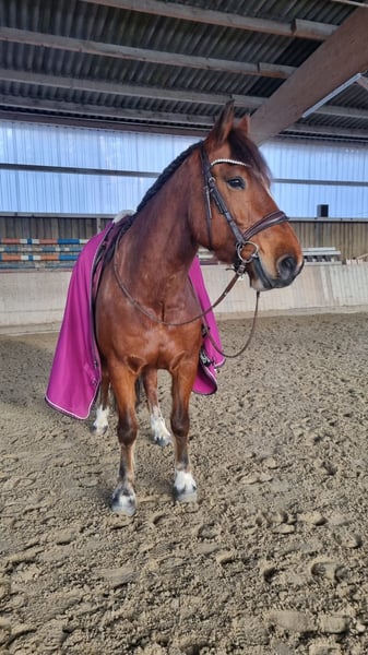 Eddie Enzo Freiberger Wallach Geb. 2015 Barhuf Aktuell Offenstallhaltung 152cm Mitte 2023 haben wir aus einem Schulbetrieb einen zweiten Freiberger gekauft für meinen Partner (Reitanfänger). Leider ist er kein Anfängerpferd, da er gerne buckelt. Wir haben ihn auf den Kopf stellen lassen (Blut, Röntgen, Magenspiegelung, PSSM 1 und 2 inkl Muskelbiopsie), es wurde aber nichts gefunden (ein ggr. Spatbefund ohne klinische Relevanz, hierzu gibt es sogar ein Gutachten). Seitdem er hier ist, wurde er 2023 noch professionell eingefahren (ein- und zweispännig). Ich fahre ihn nur am Zweispänner links und dort läuft er wirklich gut, fröhlich und engagiert. Allerdings fahre ich nicht soooo viel Kutsche, dass er genügend Bewegung hätte (weshalb er gerade auch echt fett ist). Er läuft fast täglich in der Führanlage und hat trotz seiner Figur eine super Kondition. Ansonsten habe ich Longe mit ihm neu aufgebaut, Verladetraining etc. Bodenarbeit kannte er schon und liebt er. Zu Beginn bin ich ihn auch draussen geritten, aber da fühlte ich mich wie auf einer Atombombe. Seit Anfang 2024 wird er nicht mehr geritten. Im Schulbetrieb vor uns hatte er wechselnde Reiter, war regelmäßig draussen und ist auch gesprungen. Ebenfalls lief er im Ponyclub mit sehr kleinen Kindern mit. Charakterlich ist er ein Kuschler, gutmütig mit Kindern, anhänglich, aber manchmal ein Nervenbündel ohne Grund. Ich verkaufe ihn als Kutschpferd. Geritten werden kann er sicherlich (er hat tolle Grundgangarten), aber seine Stärke und Vorliebe ist die Kutsche. Als Reitpferd ist er mir zu "unberechenbar". Ich wünsche mir für ihn Offenstall oder zumindest tagsüber in der Herde draussen (Box kennt er nicht wirklich) und mehr Bewegung und Ansprache als ich sie ihm bieten kann. Er ist regelmäßig geimpft, entwurmt und einmal jährlich wurden Zähne gemacht (zuletzt vor 2 Wochen). Bei weiteren Fragen gerne melden.