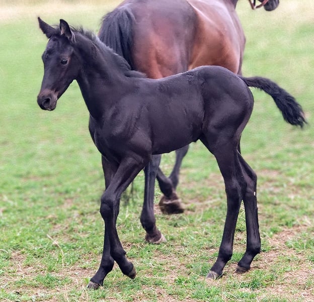 Stunningly beautiful shiny bay foal is already looking for his person. He was born on July 12, 2025, and is already about 1 meter tall. A long-legged and very noble young man, who could one day have the world at his feet. He shines like polished and is more of the calm type. He is simply beautifully captivating. His mother is our Trakehner mare with a very noteworthy pedigree. His father is our licensed and ultra-rocky Friesian stallion. He will receive a passport from ZSSE with proof of lineage. We charge €15 for the viewing, which will of course be deducted from the purchase price. If you like this sweet little guy, just get in touch. An appointment for viewing can be arranged soon.