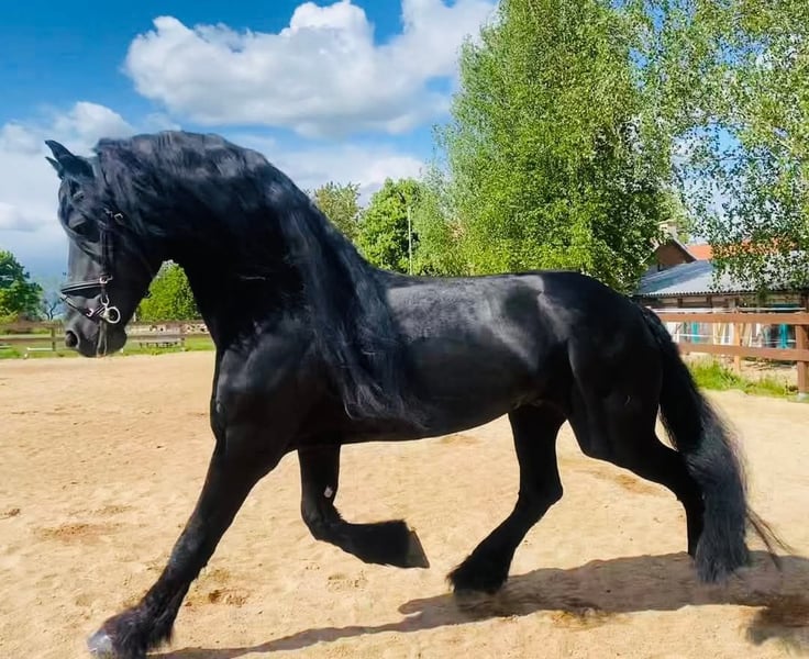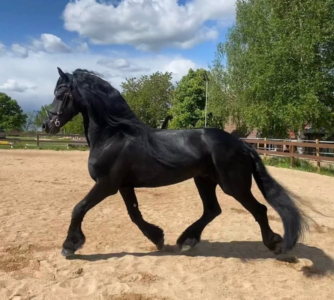 Elegant Friesian Stallion for Sale Discover the beauty and grace of this stunning Friesian stallion, born in 2017. Standing at 167 cm, this black beauty exudes presence and refinement. Expertly trained in dressage, he showcases natural athleticism and a gentle temperament, making him an excellent choice for riders seeking both performance and elegance. Whether you're aiming to compete or enjoy leisurely rides, this remarkable horse is ready to become a valued addition to your stable. Don’t miss the opportunity to own a distinguished Friesian with exceptional qualities. Visit titanstables.org to see more..