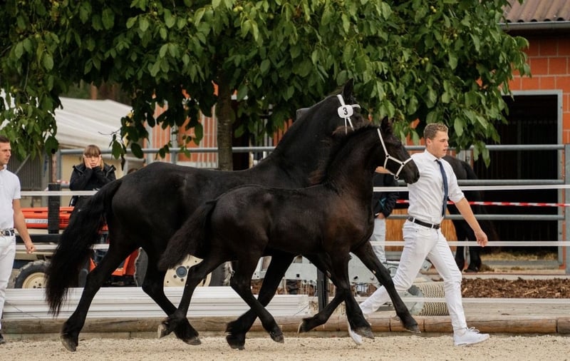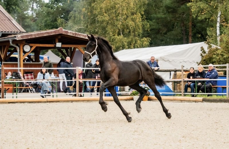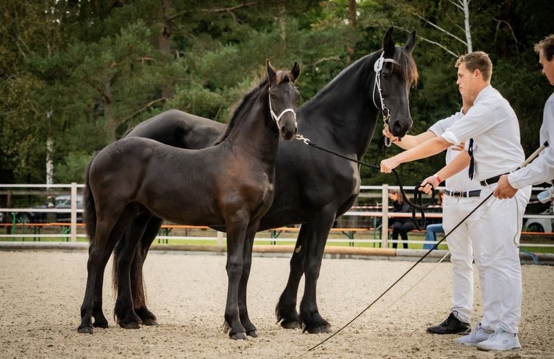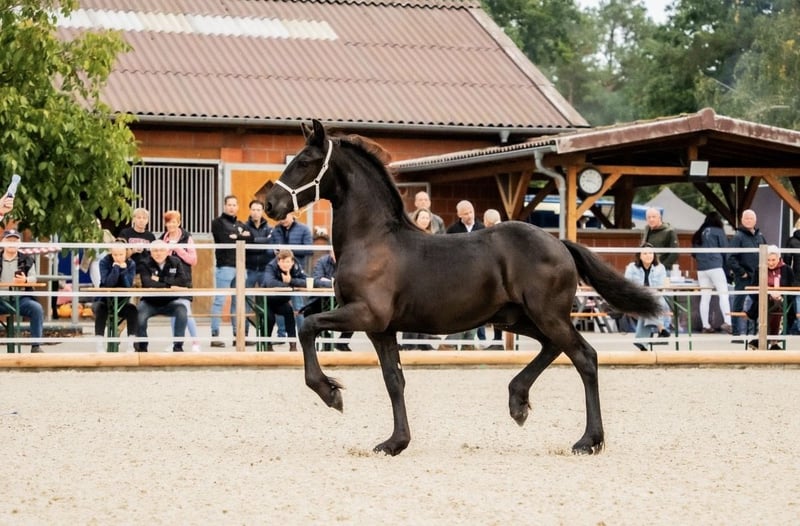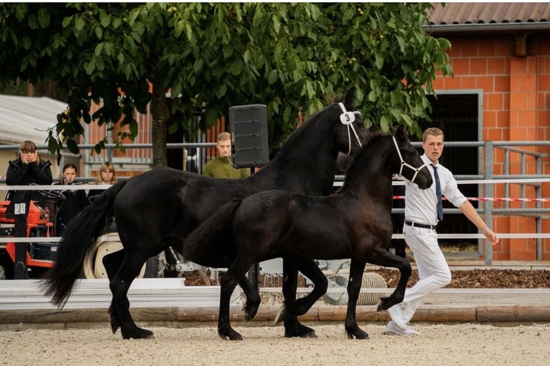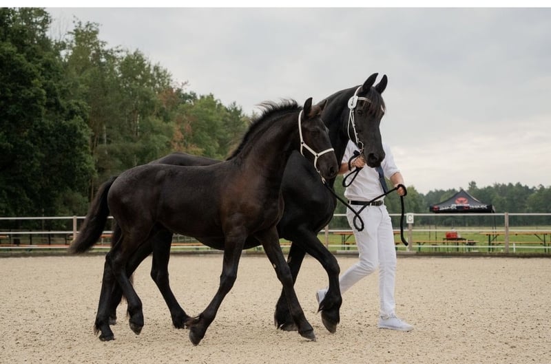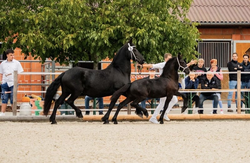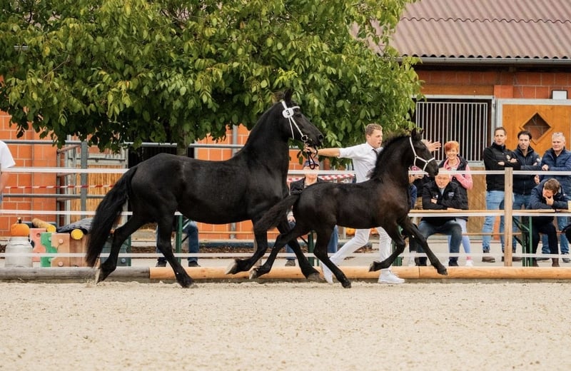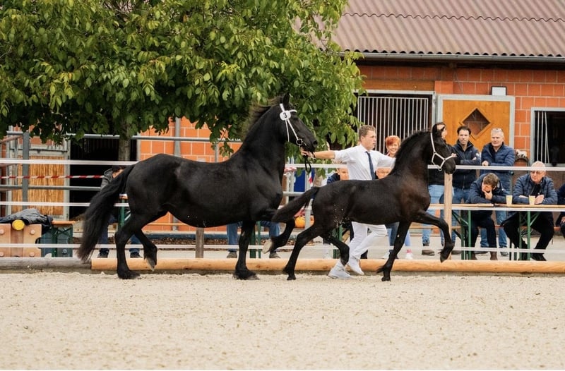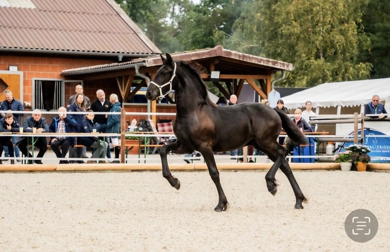 🖤 Foal of Friesian stallion Elias 494 – born on April 25, 2025 🖤 One of the last offspring of this beautiful stallion, who sadly passed away earlier this year. Dyk vom Zwönitztal is a stunning, typy Friesian foal with excellent pedigree. Born on April 25, 2025, this young stallion already impresses with plenty of expression, correct conformation, and lovely movement. He received a second premium at the KFPS Friesian breeding show in Hosena. Sire: Elias 494 – KFPS studbook stallion, renowned for his impressive presence, rideability, and offspring with top character. Dam: a KFPS registered mare by Ulke 338 Stb Sport. Description: This foal captivates with its elegant type, expansive movements, and a friendly, open-minded temperament. Perfect for breeding, shows, or future sport. He is raised appropriately within a herd, regularly wormed, vaccinated, and attended to by the farrier. Date of birth: April 25, 2025 Breeding association: KFPS Location: Zwönitz Price: €6,500 negotiable We look forward to serious inquiries. Videos and further information gladly available upon request. 📞 Contact: Rudolph family