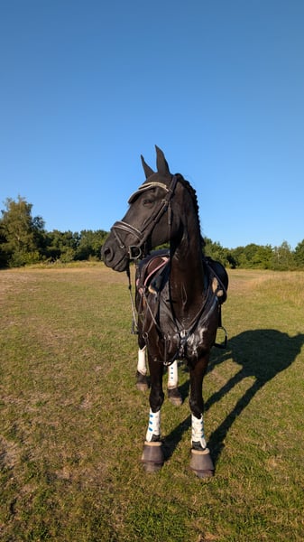 With a heavy heart, I am seeking a new, loving home for my wonderful Friesian mare, Thalia (born 2012). I purchased Thalia directly from the breeder as a two-year-old, and she has been in my possession ever since. She has been used in a variety of disciplines and activities. From circus tricks to competition participation (E-level eventing, rider competitions with her riding partner), as well as numerous festive parades with drums and cannons, ring riding, and rides alone, in groups, or with a sidewalker—nothing is impossible for Thalia. She always remains calm, keeps her nerves, and is easy to handle in any situation. In the herd, she is low-ranking and very social (avoiding conflicts). She loads and travels easily alone, and is always well-behaved at the blacksmith (barefoot). Thalia is simply extremely uncomplicated to handle and always gives her best for her person. Since she is suitable for breeding, she successfully and instinctively foaled a healthy, typy filly in 2019 (Friesian x Hanoverian). The foal is also in my possession and has already been placed in jumping up to A* level and in eventing (see the last three photos). This is not a distressed sale! I will only rehome Thalia if everything truly fits. Inquiries from dealers and riding schools will not be answered. Due to her breed, she is not suitable as a weight carrier. Additional photos and videos available upon request.