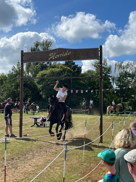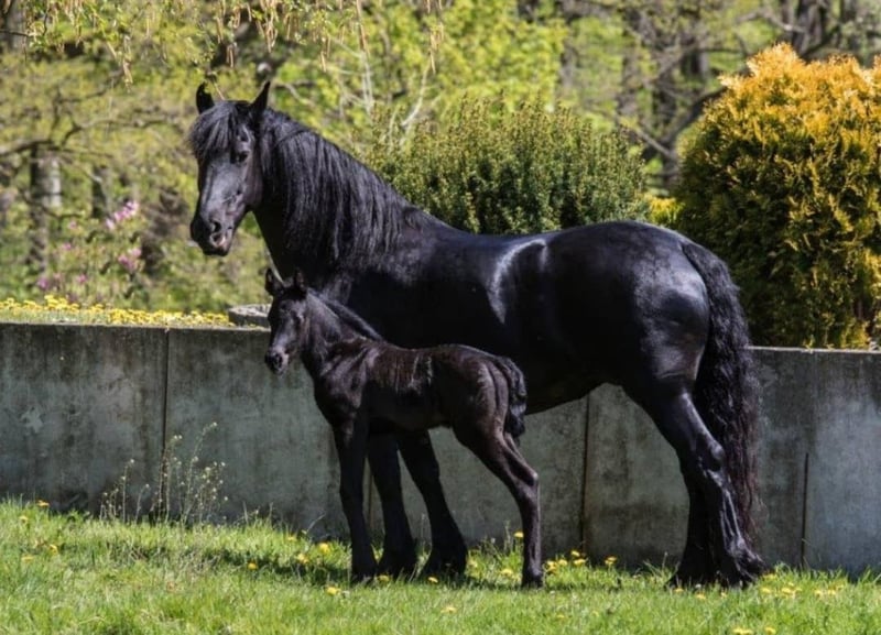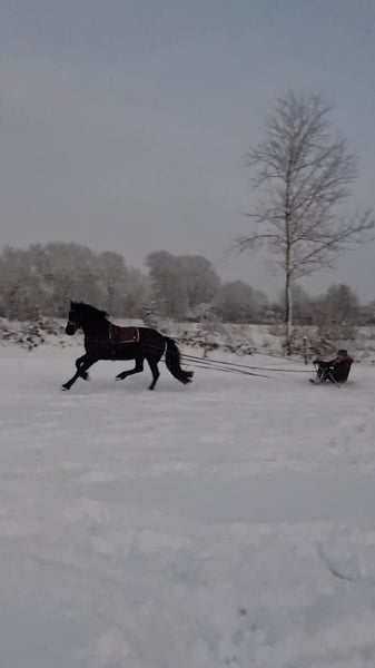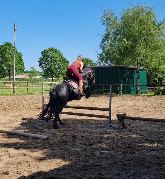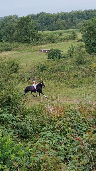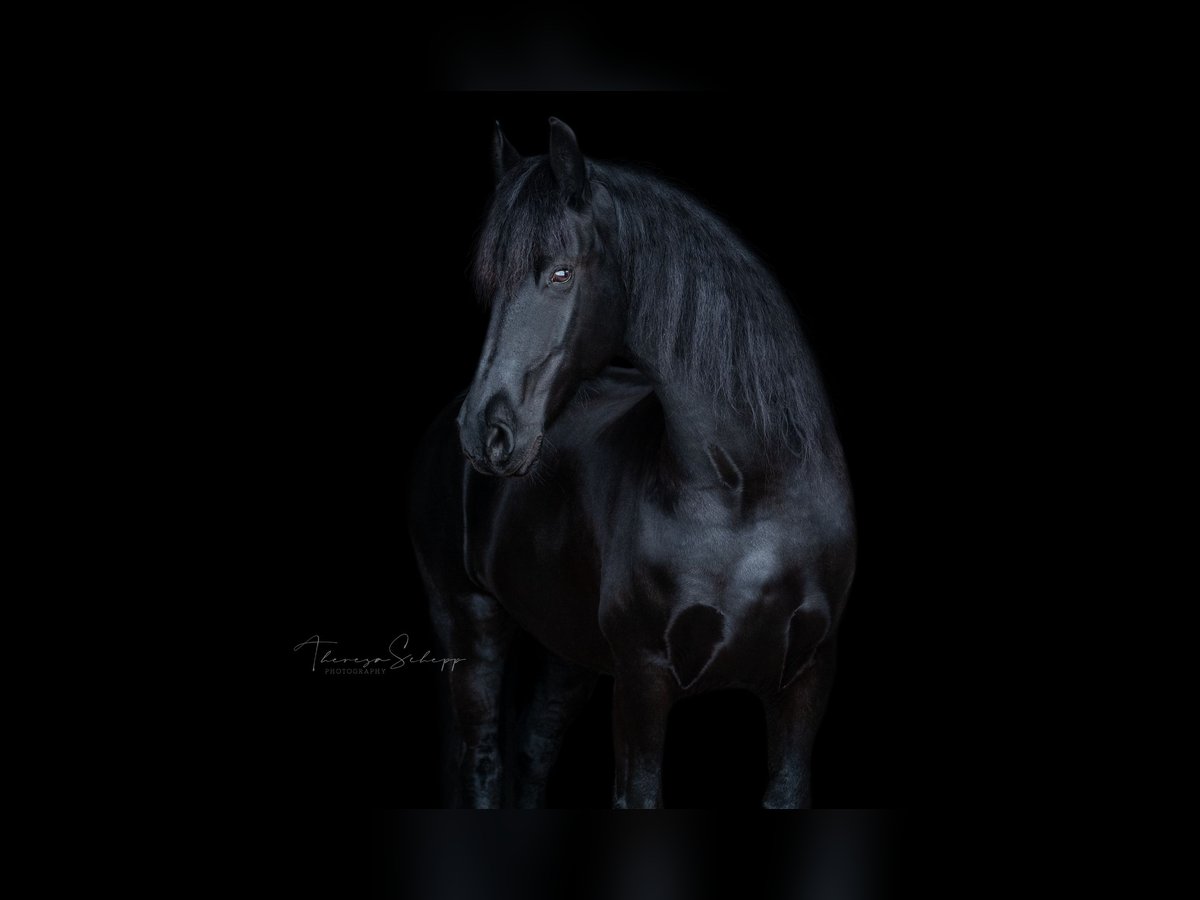 With a heavy heart, I am seeking a new, loving home for my wonderful Friesian mare, Thalia (born 2012). I purchased Thalia directly from the breeder as a two-year-old, and she has been in my possession ever since. She has been used in a variety of disciplines and activities. From circus tricks to competition participation (E-level eventing, rider competitions with her riding partner), as well as numerous festive parades with drums and cannons, ring riding, and rides alone, in groups, or with a sidewalker—nothing is impossible for Thalia. She always remains calm, keeps her nerves, and is easy to handle in any situation. In the herd, she is low-ranking and very social (avoiding conflicts). She loads and travels easily alone, and is always well-behaved at the blacksmith (barefoot). Thalia is simply extremely uncomplicated to handle and always gives her best for her person. Since she is suitable for breeding, she successfully and instinctively foaled a healthy, typy filly in 2019 (Friesian x Hanoverian). The foal is also in my possession and has already been placed in jumping up to A* level and in eventing (see the last three photos). This is not a distressed sale! I will only rehome Thalia if everything truly fits. Inquiries from dealers and riding schools will not be answered. Due to her breed, she is not suitable as a weight carrier. Additional photos and videos available upon request.