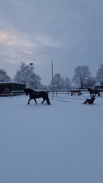 Z ciężkim sercem szukam dla mojej wspaniałej klaczy fryzyjskiej Thalii (ur. 2012) nowego, kochającego domu. Thalia została zakupiona bezpośrednio od hodowcy, gdy miała 2 lata, i od tego czasu jest w moim posiadaniu, była wykorzystywana w różnych dziedzinach. Od lekcji cyrkowych po starty w konkursach (wielobój konny na poziomie E, konkursy skokowe z jej opiekunem jeździeckim), poprzez różnorodne parady z bębnami i wystrzałami z armat, ringreiten, aż po samotne, grupowe lub z koniem towarzyszącym wyjazdy – dla Thalii nie ma rzeczy niemożliwych, zachowuje nerwy i jest zawsze do ręki. W stadzie zajmuje niską pozycję i jest bardzo towarzyska (unika konfliktów). Bez problemu załadowuje się i jedzie sama, a podczas czyszczenia jest zawsze grzeczna (bez buta). Thalia jest niezwykle łatwa w obsłudze i zawsze daje z siebie wszystko dla swojego jeźdźca. Ponieważ jest interesująca jako matka, w 2019 roku bez problemu i instynktownie urodziła zdrową, typową klacz fryzyjską (fryzyjska x hanowerska). Klacz ta również jest w moim posiadaniu i obecnie startuje w skokach do poziomu A* oraz w konkurencjach wszechstronnych (widoczna na ostatnich trzech zdjęciach). Nie jest to sprzedaż pilna! Oddaję Thalię tylko wtedy, gdy wszystko będzie naprawdę odpowiednie! Nie odpowiadam na zapytania od handlarzy i szkół jeździeckich. Ze względu na jej rasę, nie jest ona koniem obciążeniowym! Dodatkowe zdjęcia i filmy na życzenie.