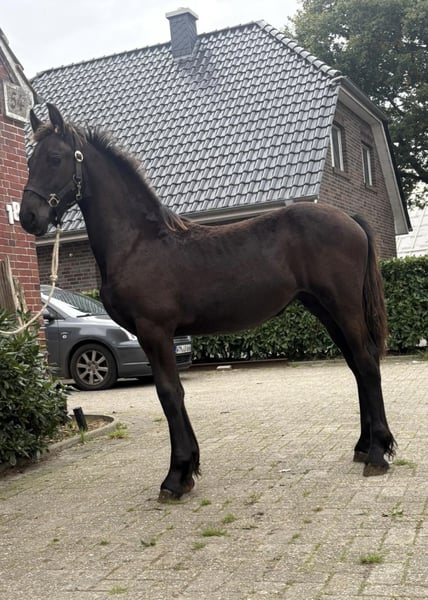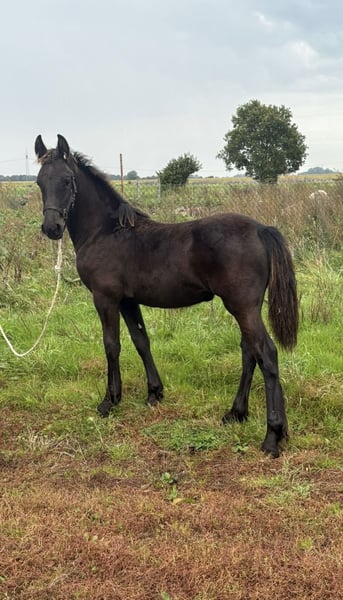 I am offering my filly foal born in March 2025. The dam is a sporty Baroque Pinto mare, and the sire is a Friesian stallion. The foal is not registered, but a passport will be provided at the time of sale. She has a wonderful presence, an alert attitude, and excellent basic gaits. She is accustomed to road traffic, dogs, and is friendly and open-minded towards everyone. Please feel free to contact me if interested. Phone: 015221813857