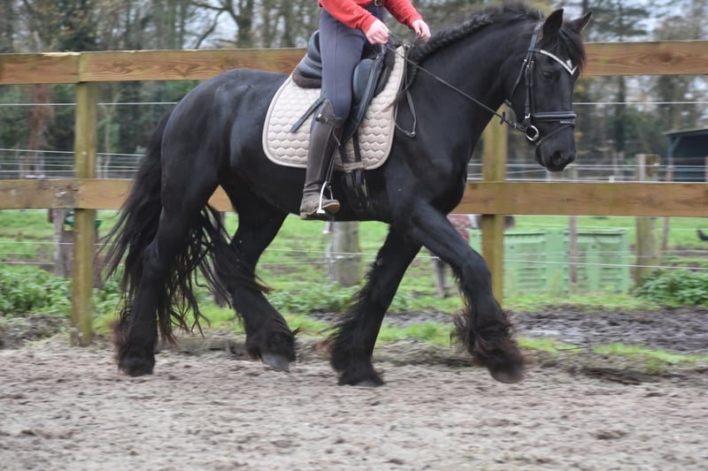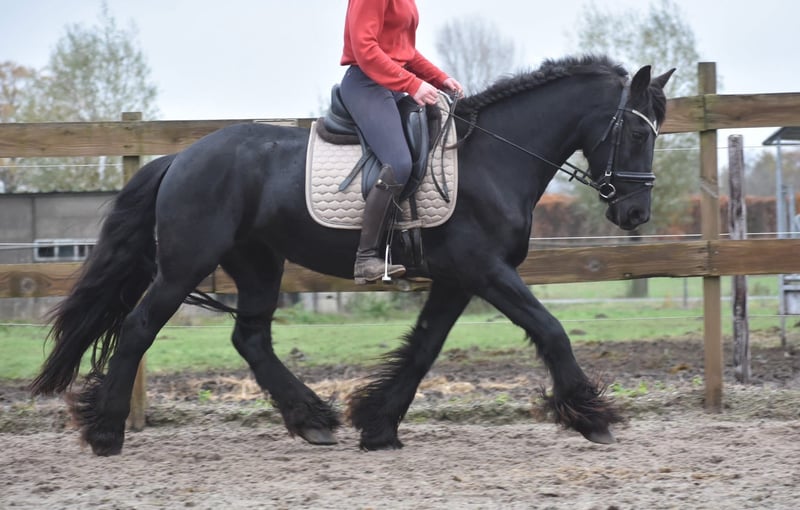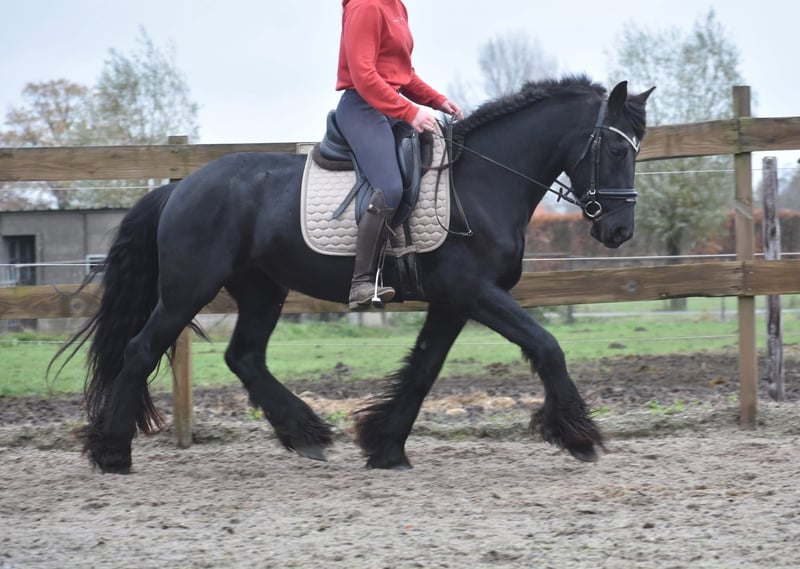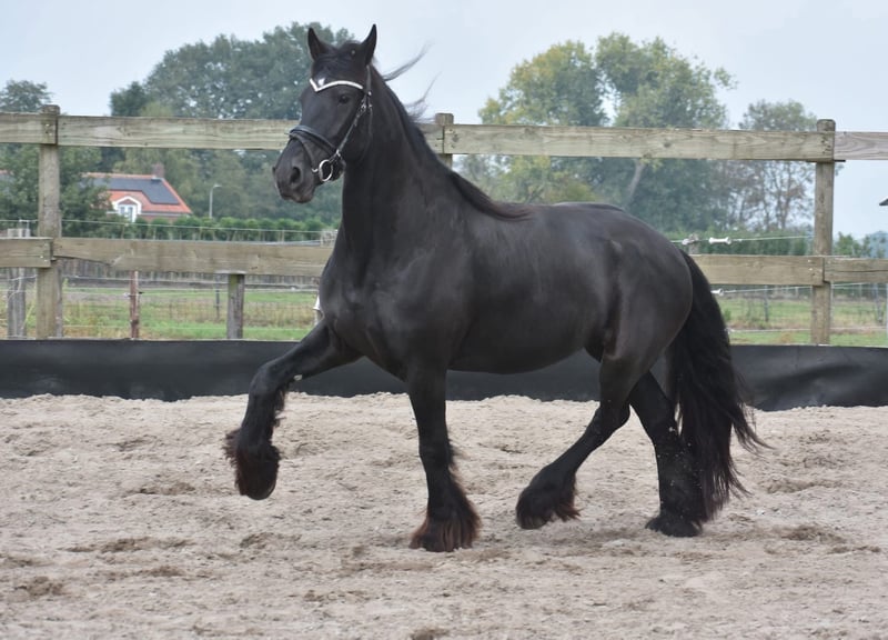 Absolut atemberaubende, äußerst ehrliche und 100 % korrekte Friese Stute Hier ist sie: Marina! (Geburtsname Maria). An ihren ehrlichen, goldglänzenden Augen erkennt man sofort, dass diese Dame einen äußerst zuverlässigen Charakter hat. Dies ist eines der wenigen Pferde, bei dem wirklich nichts zu beanstanden ist. Super ehrlich, ruhig und lieb. Sie verfügt über drei sehr korrekte, hochbeinige, aber dennoch großzügige Gänge, die sie äußerst sporttauglich machen. Sie besitzt einen aktuellen Körbericht inklusive Blutprobe, mit dem sie ohne jegliche Einschränkung für den Sport zugelassen wurde! Sie ist völlig frei von Mängeln. Derzeit ca. 1,58 m groß. Marina wurde am 5. Mai 2021 in Spanien geboren! In den Niederlanden hat sie ein Fohlen bekommen. Die Besitzer haben sich entschieden, das Fohlen zu behalten, und so darf Marina zu einer neuen, liebevollen Besitzerin ziehen. Sie ist bei ihnen für die Kutsche zugelassen, siehe Video. Wir reiten sie regelmäßig dressurmäßig und freizeitmäßig, und das klappt hervorragend – sie hat noch keinen einzigen falschen Schritt gemacht. Dies ist eine schwarze Perle. Ein echtes Unikat.