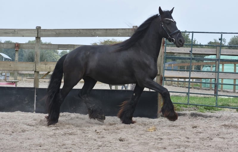 Wunderschöne, äußerst ehrliche und 100 % korrekte Friesenstute Hier ist sie: Marina! (Geburtsname Maria) An ihren ehrlichen, goldenen Augen erkennt man sofort, dass diese Stute einen äußerst zuverlässigen Charakter hat. Dies ist eines der wenigen Pferde, bei dem wirklich nichts zu beanstanden ist. Sehr ehrlich, ruhig und lieb. Sie verfügt über drei sehr korrekte, hochstehende, aber dennoch großzügige Gänge, die sie sehr gut für den Sport geeignet machen. Sie besitzt ein aktuelles Körerungszeugnis inklusive Blutprobe, mit dem sie ohne jegliche Einschränkung für den Sport zugelassen ist! Sie ist vollkommen frei von Mängeln. Derzeit ca. 1,58 m groß. Marina wurde am 5. Mai 2021 in Spanien geboren! In den Niederlanden hat sie ein Fohlen bekommen. Die Besitzer haben sich entschieden, das Fohlen zu behalten, und so darf Marina zu einer neuen, lieben Besitzerin oder einem neuen Besitzer ziehen. Sie ist bei ihnen für die Kutsche vorgängig vorgestellt worden, siehe Video. Wir reiten sie regelmäßig dressurmäßig und freizeitmäßig, und das klappt hervorragend, sie hat noch keinen falschen Schritt gemacht. Dies ist eine schwarze Perle. Ein Unikat. Preis: 9.750 € inklusive Marken-Sattel und Trense