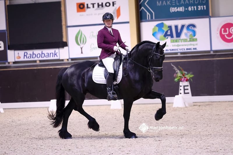 Anke is a talented 9-year-old Friesian star sport mare offered directly from the breeder. Haike 482 X Doaitsen 420 Gentle in handling, she can get a bit hot under the saddle but always remains honest and wants to work for you, and is very eager to learn, quickly picking up the work. She is currently competing at Z1 level with wins and is starting to work on the changes. She is also very suitable and interesting for breeding. She comes from line 36. She has full papers and is low in inbreeding and relatedness. Height: 1.65 m. She is free from dwarfism, chestnut factor, and hydrocephalus. The mare has already had a foal at her side before entering sports. She is a good and caring mother for her foal. Recently visited the dentist and has been clinically and radiologically approved. Re-examination is not a problem. K.K.