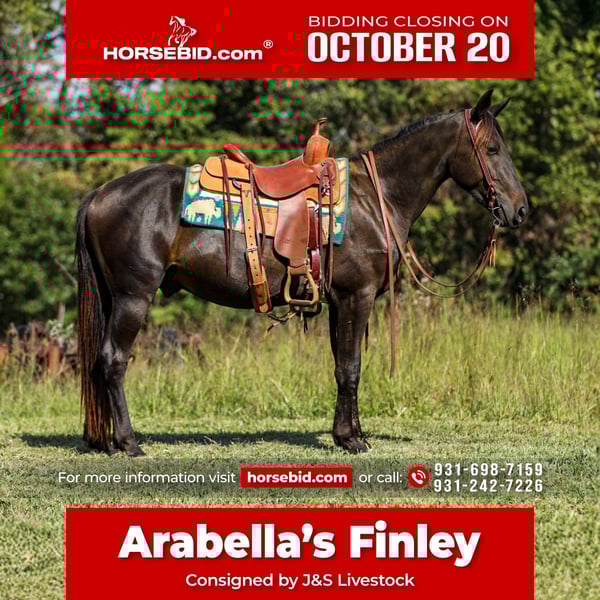♦️ 𝐭𝐡𝐞 𝐀𝐌𝐄𝐑𝐈𝐂𝐀𝐍 𝓕𝓪𝓵𝓵 𝓒𝓵𝓪𝓼𝓼𝓲𝓬 ♦️ Happening now thru MONDAY | OCTOBER 20th - Available EXCLUSIVELY on HorseBid's website! For more details and to register visit: www.Horsebid.com CONSIGNOR CONTACT: J&S Livestock J.T. 931-698-7159 or Bailey 931-242-7226 LOCATION: Santa Fe, TN BREED: Friesian Sport Horse REGISTERED: Yes REGISTERED NAME: Arabella’s Finley COLOR: Black HEIGHT: 15 AGE: 3 GENDER: Gelding Arabella’s Finley is a 2022 model registered Friesian Sport Horse gelding standing 15 hands tall. This sweet gelding is super friendly and has so much potential to take in multiple directions. He’s athletic, gentle, and super willing along with being a beautiful mover. For a young gelding, he has seen more than most. He’s been exposed to various terrains- cattle, water and noisy traffic- not much seems to phase him. He has been trail rode a ton, alone and in group. He has been started correctly and has a naturally gentle attitude. He stands great to be mounted and tacks up nicely. Stands perfectly still for a bath, and trailers and hauls well. This is the type of young gelding that’s easy to get along with- I truly believe he’ll always have that cool, calm and collected demeanor about him forever, which can sometimes be hard to find. Finley has a current coggins and a recent PPE. For any further information, feel free to reach out. Call or text J.T. 931-698-7159 or Bailey 931-242-7226.