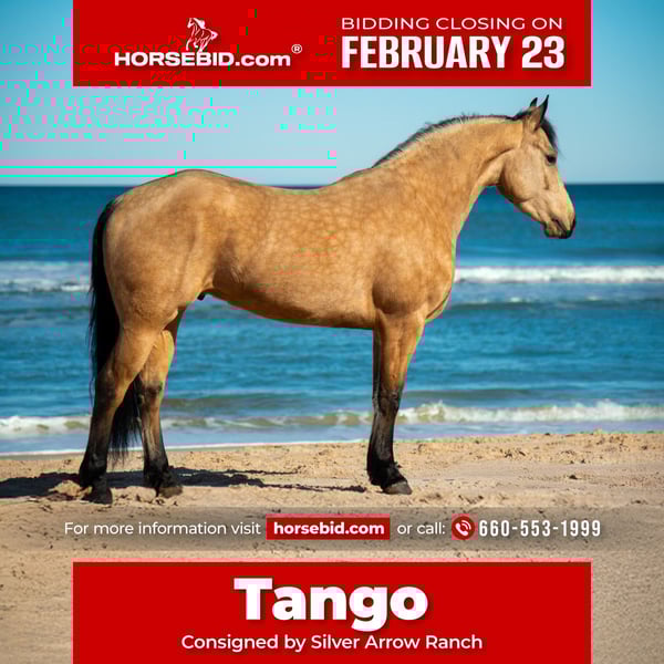 💎 𝐓𝐇𝐄 𝓓𝓲𝓪𝓶𝓸𝓷𝓭 𝐒𝐇𝐎𝐖𝐂𝐀𝐒𝐄 💎 Happening now thru MONDAY | FEBRUARY 23rd - Available EXCLUSIVELY on HorseBid's website! For more details and to register visit: www.Horsebid.com CONSIGNOR CONTACT: Silver Arrow Ranch 660-553-1999 LOCATION: Ocala, FL BREED: Friesian cross REGISTERED: No REGISTERED NAME: Tango COLOR: Buckskin HEIGHT: 15 AGE: 5 GENDER: Gelding Some horses are just pretty. Tango is the one that makes you feel something. He’s the buckskin Friesian cross that turns heads everywhere he goes, but what really gets you is how he feels to ride — athletic, balanced, talented, and naturally gifted, yet still comes with that magical “woah.” One day he’s schooling dressage. Another day he’s wandering quietly down the trails. Then he’s on the beach, ears forward, completely taking it all in. See a jump? He’s game. Load up and go somewhere new? No problem. Tango has seen the world and genuinely enjoys it. And on the ground? That’s where he completely steals your heart. Puppy dog personality. Easy to catch. Easy to load. Easy to shoe. He ground ties, cross ties, single ties — the kind that just wants to be your buddy. The type of Friesian everyone hopes they’ll find… …but rarely ever do.