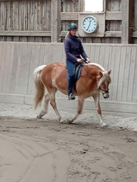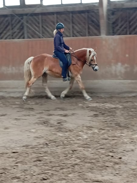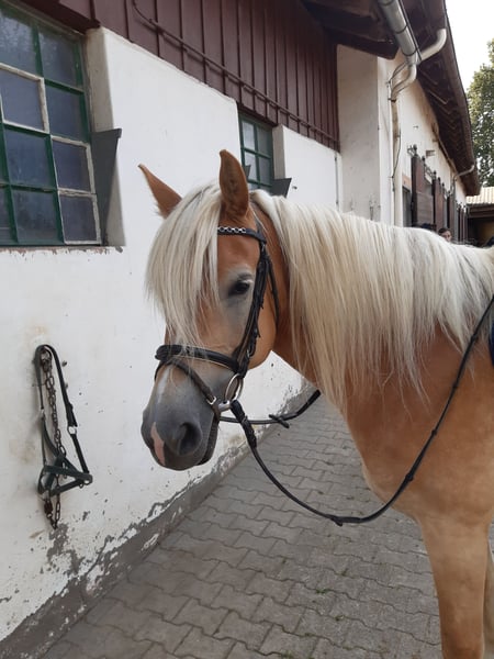 Aus Zeitgründen verkaufen wir unsere 5 jährige, selbst gezogene Haflingerstute. Sie ist bisher nur leicht geritten, also eher als angeritten zu bezeichnen. Unsere wenigen Ausflüge ins Gelände hat sie brav absolviert, auch ohne Begleitpferd. Sie ist unbeschlagen und geht in einer Kleingruppe auf die Koppel. Im Umgang ist sie sehr brav und immer bemüht alles richtig zu machen. Sie ist sehr menschenbezogen und würde sich deshalb sicher als Therapiepferd eignen. Durch ihre Größe und ihren kräftigen Körperbau deckt sie auch größere oder kräftigere Reiter gut ab.