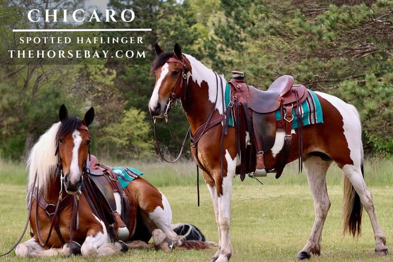 She Rides/Does Tricks/Jumps/Started driving make sure to check her out she’s just a little bit special! Meet Chicaro she is defiantly a favorite ride every time and anyone that has ridden her wants to ride her again. It’s because of her personality, her willingness, her smooth gaits, and she’s such a nice handy size. And of course don’t forget she’s easy on the eyes. Chicaro is a 3 yr old Spotted Haflinger Cross she has a little bit of paint a little bit of Haflinger and a little bit of some draft in her to make the perfect nice stocky drafty type horse that is not gigantic and everyone can enjoy. She’s stout enough to carry a bigger rider, but she’s not huge so you don’t need a ladder to get on. She stands at 14.3 hands currently but still growing. We expect her to finish out at least 15 hands tall more than likely 15.2 hands tall. Her butt is a couple of inches higher than her withers right now. She’s a one owner mare so no unknowns with her you get her full story. She was started out the right way and as you can see from her video she took to everything and surpassed expectations. She really is something special. Ok here’s her story she was started under harness last spring as a 2 yr old and had a couple of months harness training. She is not finished out that way, but has a good start if someone wants to finish her out for pulling a cart. Then she was broke out to ride and did so well and was very willing to please so she started on the lay down cue and as you can see she lays down pretty easy you just pick up her left front foot bring it back and she’ll do the rest. So if you do need her shorter to get on you can easily have her lay down for you. She knows how to move off of the leg shoulders, hindquarters, and started doing a nice side pass. She stops off your seat and she’s more whoa than go. She’s a little side by side out on the trails you can literally take her anywhere just point and go and she does. Not only that but she comes included with four wheel drive. But seriously she will go anywhere you ask she has a lot of confidence and a lot of sense. She will cross any water creeks, rivers, etc. And she’ll walk over any log or she’ll jump it for you if you want. She did so well jumping logs out on the trail that we decided let’s try her in the arena with some jumps and English tack and she did amazing. She is a natural jumper and sets herself up easily. She doesn’t mind being ridden in English tack at all. I really could see her excelling with someone in 4H or fun shows she doesn’t mind arena work and has a natural nice little quarter horse lope and an easy jog trot to sit to. She has the buttons and is ready to take it a step further if someone wants to go in that direction with her. She does NOT spook easily. She does NOT care about traffic a bit. She has great ground manners stands good for mounting, tacking, and picking out her feet. She’s also good for the vet. She’s an easy keeper NO bad habits and NO maintenance. She can ride out alone or with another horse either front or back. She loads right in the trailer and backs right out. Stands tied quietly. She’s pretty easy to get along with. She’s very level headed and sensible. She is smart and seems to learn quick and pick up on new things easily. So to round things up she lays down to mount, started on jumps, started under harness, and she’s a handy trail machine. She’s this good at this age just imagine what she’ll be like in a couple more years and done growing. It’s hard to find these special ones like her this size and this handy. She’s an awesome trail horse and I could easily see her as someone’s fun playday horse at the fun shows and doing some jumps she would easily excel at anything you put her into.