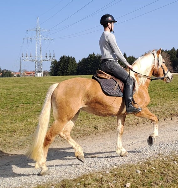 Pela est à la recherche d'une nouvelle famille. C'est une jument élégante de 6 ans, affectueuse, dotée d'une grande énergie. Grâce à son caractère équilibré, elle convient parfaitement comme cheval de loisir, que ce soit pour la randonnée ou le traîneau. Elle peut également évoluer vers le sport, comme l'ont déjà prouvé plusieurs chevaux issus de cette lignée. Pela a déjà été monté en extérieur et a été conduite en attelage à deux. Elle a aussi donné naissance à deux poulains, tous deux élevés dans notre écurie située dans le magnifique Allgäu. Tous nos chevaux grandissent en troupeau dans notre élevage, en été sur de vastes pâturages et en hiver dans un box avec un grand espace de liberté. Si vous cherchez un jeune cheval talentueux avec lequel vous ou toute votre famille pourrez prendre plaisir, Pela vaut certainement la peine d’être visitée. Nous sommes une exploitation familiale qui, depuis trois générations, élève des Haflingers depuis 50 ans. Chez nous, vous trouverez également des hongres ou des yearlings, ainsi que des juments de 3 ans, qui seront présentés au printemps. Toutes nos juments ont été montées en extérieur et en attelage, en hiver en traîneau et en été en marathon. Si vous êtes intéressé, nous serions ravis de vous présenter un Haflinger plein d’affection.