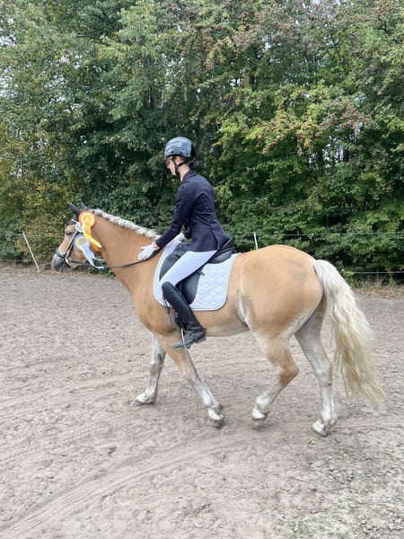 Arsel is een echt hartendier. De sport Haflinger overtuigt met zijn gouden karakter en is voor ieder plezier te hebben. Hij staat nu bijna vier jaar aan mijn zijde en in die tijd hebben we veel samen meegemaakt. In de dressuur kunnen zowel kinderen als gevorderde ruiters veel van en met hem leren. Ik heb hem de afgelopen jaren wekelijks ingezet voor de kinderles op onze stal; hij toont zich daarbij altijd zeer braaf en voorzichtig en heeft ook de allerkleinsten heel veel geleerd. Maar hij wil ook uitgedaagd worden; zijgangen kent hij en ook de buitengalop vormt geen enkel probleem voor hem. Hij heeft ook wedstrijdervaring en blijft daarbij kalm en ontspannen. Hij gaat probleemloos op de trailer, zowel alleen als met andere paarden. Ook springen en cavaletti-werk vindt hij erg leuk, hiervoor heeft hij echter een ervaren ruiter nodig die hem vertrouwen kan geven. We zijn ook regelmatig op het buitenritterrein geweest; hier blijft hij heel rustig, springt graag en gaat zonder problemen door water. Uitreiten in groepsverband of solo is geen enkel probleem. Verder is hij voor ieder plezier te hebben: rijden met halster, grondwerk, longeerwerk, rijden zonder zadel, thematische kür met kostuum en vele andere dingen doet hij braaf mee en hij wil altijd gefallen. Hij staat bij ons de hele dag in een ruinengroep buiten en ’s nachts in de box. In al die tijd is hij nooit kreupel geweest of ziek; er zijn geen bekende voorgeschiedenis. Ik kan me hem goed voorstellen voor ambitieuze recreatieruiters of ook als gezinspony. Het is GEEN noodgeval en hij wordt alleen in de allerbeste handen geplaatst. Bij serieuze interesse stuur ik graag video's toe. Ik beantwoord alle verdere vragen en een proefrit is mogelijk. Als je denkt dat Arsel bij jou past, neem dan gerust contact met me op via WhatsApp (49 1749799082) of stuur hier een bericht. We kunnen ook een telefonische afspraak maken.