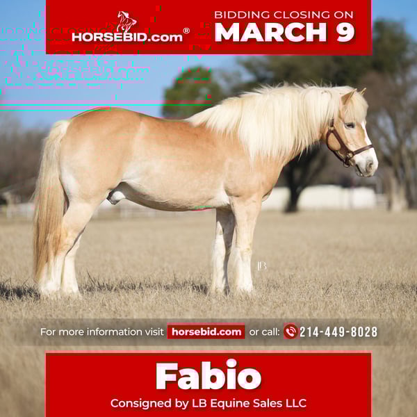 ℳ𝒶𝓇𝒸𝒽 ♦️𝐑𝐈𝐃𝐄𝐑'𝐒 𝐂𝐇𝐎𝐈𝐂𝐄♦️ Happening now thru MONDAY | MARCH 9th - Available EXCLUSIVELY on HorseBid's website! For more details and to register visit: www.Horsebid.com CONSIGNOR CONTACT: LB Equine Sales LLC 214-449-8028 LOCATION: Terrell, TX BREED: Haflinger REGISTERED: Yes REGISTERED NAME: An- Ultimatium YRF COLOR: Chestnut HEIGHT: 14.2 AGE: 13 GENDER: Gelding “Fabio” is just that — fabulous! A 13-year-old purebred registered Haflinger gelding with luxurious feathering and the sweetest disposition. There is something so striking about Fabs — we just can’t get enough of this cute guy. Fabio stands a sturdy 14.2H. He’s heavy-boned and strong as an ox in stature, yet kind and approachable. He has confidently packed larger husbands down the trail with ease and has proven himself a reliable trail mount year after year. He’s been with the same family for the past eight years and is now ready to bring his fun-loving character to your family farm. Honestly, Fabio should have a sign around his neck that says “Will Work for Cookies,” because this boy loves his treats! Warning: you may find yourself wanting to spend more time with Fabio in the barn, ring, and out on the trail than with your own husband. Fabio is happy-go-lucky, jolly, and just the right amount of goofy. If you’re looking for a friendly, charismatic, and gentle gelding — Fabio is your man. He’ll play with lead ropes, toss around balls, and splash happily in the water. He isn’t afraid of cows or wildlife and has frequently been used on a cattle ranch to check fences, sort cattle, and move pastures. He crosses water, navigates bridges, and steps into ravines confidently. He’s a total puppy dog on the ground — easy to catch, clip, tie, load, and back out of the trailer. He stands quietly for mounting and is well-mannered for the farrier and vet. He was recently body-clipped (standing in the cross ties for three hours with no twitch!). Over the years, he has mainly been a trail horse and has tolerated all sorts of silly shenanigans — including the owner’s son shooting arrows off his back while he stood like a statue. Fabio has been started in driving by a professional teamster, though he is not yet finished to cart. He also spent several months under the guidance of Elliot Holtzman and Caitie Holtzman of Versatile Horsemanship to further refine him under saddle. He has smooth, quality movement suitable for progressing up the levels in dressage and is currently schooling First Level. He is proficient in leg-yields, lengthenings, stretching in his circles, and simple changes. He can be a bit lazy if allowed, but he will happily step up into the trot and canter when asked. I consider him perfectly in the middle, not a racecar but not a deadhead plug either. He has a fantastic “whoa” button and comes right back down off your seat. Ride him in a snaffle, halter, or bosal — he is soft, responsive, and willing. He would also transition beautifully into a therapy-type home and is suitable and safe for my older clientele. Whether it’s short hacks around the property or long adventures through forest and plains, Fabio is confident and steady wherever you point him. I wouldn’t hesitate to load him up and head to any preserve, park, or country trail — he’s sure-footed, quiet, and has an excellent brain. He has also recently been used for lessons with novice children, where he proved obedient, tolerant, kind, and gentle. He has always been 100% sound and is currently barefoot. He has no leg blemishes, no known health issues, and does not require special supplements or maintenance. His AHR papers and bill of sale are in order and ready for transfer at the time of sale. A current vet statement of soundness, dental float chart, Coggins, and up-to-date vaccine records are all on file and available for viewing at your convenience. Located in Terrell, TX — we are happy to help coordinate shipping to any location.