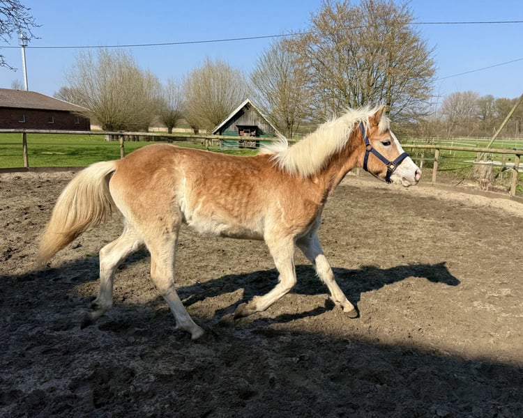 Wir verkaufen dieses hübsche Haflinger-Wallachfohlen aus einer durchgezüchteten Mutterlinie. Ernie bringt das ideale Potenzial für Sport und Freizeit mit. Er punktet neben seiner Optik und dem typischen hellen Langhaar vor allem durch einen klaren Kopf. Er ist menschenbezogen, unerschrocken und geht neugierig auf neue Aufgaben zu. Er kennt das Anbinden, Führen, Putzen, landwirtschaftliche Maschinen und Hunde. Damit bringt Ernie die wichtigsten Grundlagen der Erziehung eines Jungpferdes mit. Er ist an den Menschen gewöhnt, lässt sich überall anfassen und ist damit auf das Leben als Reit- oder Kutschpferd vorbereitet. Vor allem kennt er das nebenherlaufen an der Kutsche. Ernie ist mit seinem gleichaltrigen Kumpel Bert artgerecht in einer Herde im wunderschönen Münsterland aufgewachsen. Die weitläufigen Wiesen und Weiden haben ihnen Trittsicherheit und Gelassenheit mitgegeben, die man sich von einem jungen Haflinger wünscht. Beide Fohlen sind robust im Offenstall aufgewachsen, werden regelmäßig entwurmt und haben einen Equidenpass. Beschreibung: Name: Ernie Rasse: Haflinger (mit Edelblutanteil) Geschlecht: Wallach Geburtsdatum: 06.05.2025 Farbe: Fuchs mit hellem Langhaar Endmaß: voraussichtlich 145-150cm Zucht & Qualität: Ernie stammt aus einer offiziell eingetragenen Zucht im Münsterland. Er besitzt volle Papiere (Abstammungstafeln) vom Westfälischen Pferdestammbuch. Bei der Anpaarung wurde besonders auf Charakterfestigkeit und korrektes Fundament geachtet. Die Mutterstute kann vor Ort besichtigt werden. Ernie ist gegen Tetanus geimpft, gechippt, besitzt einen Equidenpass und wurde dem Zuchtverband vorgestellt. Eignung: Durch sein korrektes Gebäude und seine schwungvollen Grundgangarten stehen Ernie später alle Wege offen. Ob als Freizeit-Pferd, im Fahrsport oder für den ambitionierten Breitensport ist er ein nervenstarker Partner. Melden Sie sich gerne telefonisch unter: Kontakt: +49 152 05977730 Hinweis: Ein Kennenlernen ist jederzeit nach Absprache möglich! Ernie und sein Kumpel Bert können einzeln oder zusammen abgeben werden (Platz vor Preis).