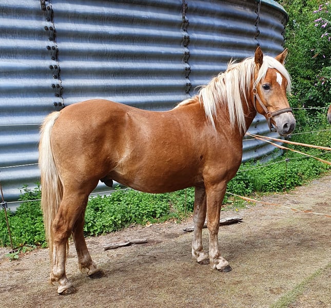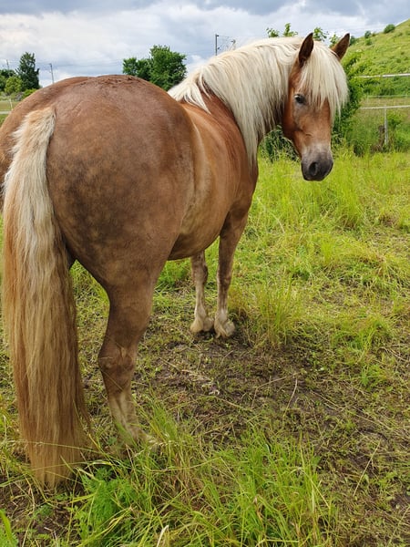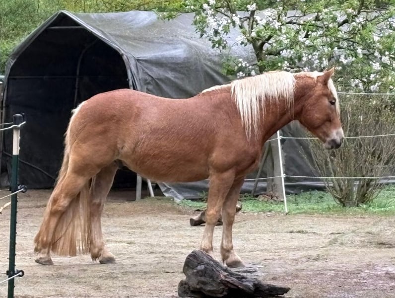 With a heavy heart, I am looking for a suitable new home for my wonderful, very sweet gelding. Last autumn, he was unfortunately diagnosed with equine asthma, despite being kept in one of the best possible stables. Currently, he is symptom-free and receives regular inhalation therapy. Due to the diagnosis, I am offering him below market value, although there is a good chance he will remain free of symptoms. Ideally, a home by the sea would be perfect for him. I bought him as a two-year-old from the breeder, where he grew up on vast, hilly pastures. He has had no negative experiences and has a natural trust in humans. As expected for his age, he is a playful gelding. A sweet cuddle-bug who is willing to do anything asked of him, albeit at a relaxed pace. He is lunged, works in double longe and long reins, and is familiar with various circus exercises. He enjoys leisurely rides in the terrain. This summer, we started gently training him for riding in the arena. He has not yet been ridden in the field and has been under saddle only about 10-12 times so far. My goal was to develop him into a relaxed trail horse with a solid basic education. Unfortunately, fate has dealt me a blow, and I can no longer give him the attention he deserves. I simply lack the time. However, he remains in training, and we could also see him as a great therapy horse, given his sweet and relaxed nature. His father is 50% Black Forest and 50% Haflinger, and his mother is a pure Haflinger mare. He looks quite Haflinger-like, but last summer, he developed a beautiful coat color that shows hints of Black Forest, as seen in one of the photos (from behind). Who knows how his appearance will develop further. He shows no bad habits with us and has been part of a mixed open stable herd. Currently, he is housed only with mares, as another gelding tried to attack him, although he was usually the herd leader. Regular hoof care and annual dental check-ups are standard at our place. He is vaccinated, including against West Nile Virus, and has been recently dewormed. He is load-friendly and even gets his hooves trimmed with a grinder by the farrier. If needed, I am happy to include his new inhaler device and his hoof boots at a fair price. Additionally, his nearly new Western saddle by DEUBER, with a special tree that fits him perfectly, could also be sold. It is very important to me that he finds a truly good home, where his gentle nature is appreciated and his potential is utilized. Therefore, the price is negotiable for the right place. NO traders! Only open stable management!