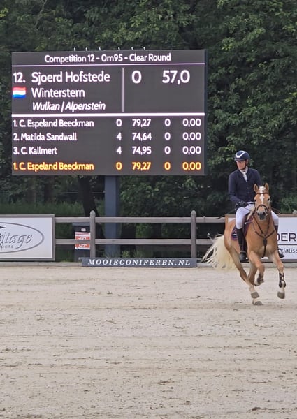 Winterstern-Wodka is in 2020 geboren en is een zoon van Liz. 481 Wulkan uit de beroemde merrie PE17718/T Soraia-Sissie (P15739/T Smelina x Liz. 150/T Alpenstein). Winterstern is geboren in Oostenrijk en hier als drie jarige hengst goedgekeurd. Wegens beperkte sperma kwaliteit is Winterstern niet ingezet voor de fokkerij en als 4 jarig paard geruind. Winterstern heeft een stokmaat van 1.55. Winterstern heeft in augustus 2024 deelgenomen aan het Europees Kampioen sport voor Haflingers in Stadl-Paura. Winterstern heeft hier een ongekende prestatie neergezet en is Europees Kampioen jonge paarden springen geworden! Winterstern heeft als 4 jarig paard een wedstrijdseizoen internationale springwedstrijden gelopen in de klasse 90/95 cm. Daarna is Winterstern uitgebracht in de dressuursport klasse L2. Winterstern vindt het ook heerlijk om bosritten te maken. Winterstern is een braaf en heeft een goed karakter. Hij is braaf bij de hoefsmid en heeft geen stalgebreken. Winterstern is PSSM-1 negatief. In november 2025 is Winterstern zowel klinisch als rontgenologisch goedgekeurd. Rapport is aanwezig. Getalenteerde allround sporthaflinger! ‐------------------------------- Winterstern- Wodka wurde 2020 geboren als Sohn von Liz. 481 Wulkan aus der berühmten Stute PE17718/T Soraia-Sissie (P15739/T Smelina x Liz. 150/T Alpenstein). Winterstern ist gezüchtet durch Johann Wagner (Muenster, Tirol, AT) und als dreijähriger gekört als Deckhengst in Ebbs (AT). Aufgrund der mangelhafte Samenqualität wurde Winterstern aus der Zucht zurückgezogen und als vierjähriger kastriert. Winterstern hat ein Stockmaß von 155 cm. Winterstern nahm im August 2024 am Europameisterschaft Sport für Haflinger in Stadl-Paura teil. Er hat hier eine besondere Leistung erzielt und ist Europameister im Jungpferdespringen geworden! Als vierjähriges Pferd nahm Winterstern an internationalen Springwettbewerben in der 90/95-cm-Klasse teil. Danach trat Winterstern in der Dressurklasse L2 an. Winterstern ist aber Sicher auch ein ideales Freizeitpferd. Mit ihm kann man stundenlange Ritte durchs Wald machen. Winterstern ist gut erzogen und hat einen guten Charakter. Er benimmt sich beim Hufschmied, beim Hängerladen und im Stall sehr gut. Er hat keine stabilen Laster. Winterstern ist PSSM-1-negativ. Im November 2025 wurde Winterstern sowohl klinisch als auch Radiologisch untersucht. Bericht ist verfügbar. Talentierter Allround-Sport-Haflinger!