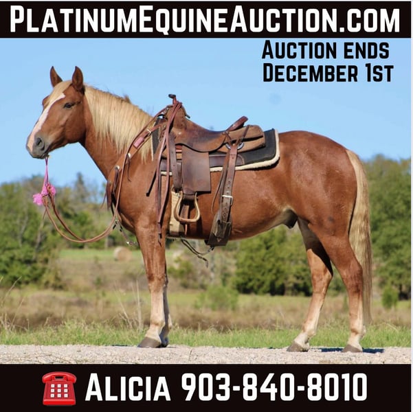 ONLINE AUCTION Place your bids at www.PlatinumEquineAuction.com Starting Bid $3500 Auction ends December 1st, 2024 Need a new saddle? Check out White Rock Saddles on our website or Facebook! Meet Sharkie! You want to talk about looks and personality plus? This is your guy. Sharkie is a 5 year old halflinger cross gelding. He stands 13.3 hands tall. Sharkie has quite the work resume! He has worked in the back of a livestock sale pushing and sorting cattle for 2 years. Sharkie has done some doctoring in a feed yard as well. Above all that, he is an excellent trail horse and is unflappable wherever you point his head. He has seen all types of terrain from west Texas to east Texas. He is traffic safe; we have ridden him next to the interstate and over overpasses. He is not spooky at all and has been around all types of farm equipment, side by sides, dogs, fireworks and gunfire. Sharkie has a one in a million personality! When you meet him you cannot help but falling in love. He LOVES people and has never met a stranger. You can call his name in a 100 acre pasture and he will come find you. He wants to be your best friend and the center of attention. Sharkie has no bad habits, he is easy to catch, saddle, bridle, bathe, trim, he will stand tied quietly all day. Point his head and he will self load onto the trailer. You can ride him bareback and in a kite string. If you have any questions about Sharkie please don’t hesitate to call or text Alicia Darling 903-840-8010 Located in Canton, TX. ONLINE AUCTION Place your bids at www.PlatinumEquineAuction.com Starting Bid $3500 Auction ends December 1st, 2024 Need a new saddle? Check out White Rock Saddles on our website or Facebook!