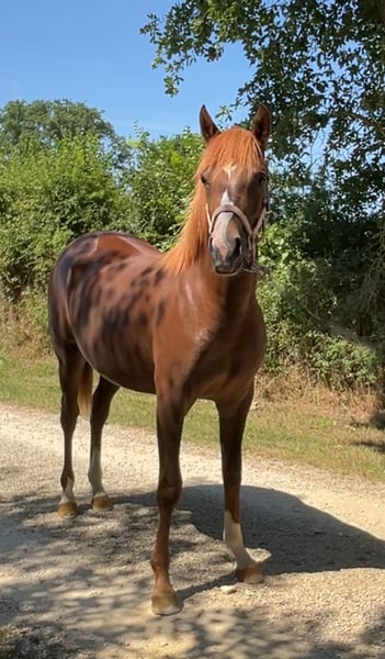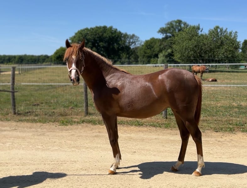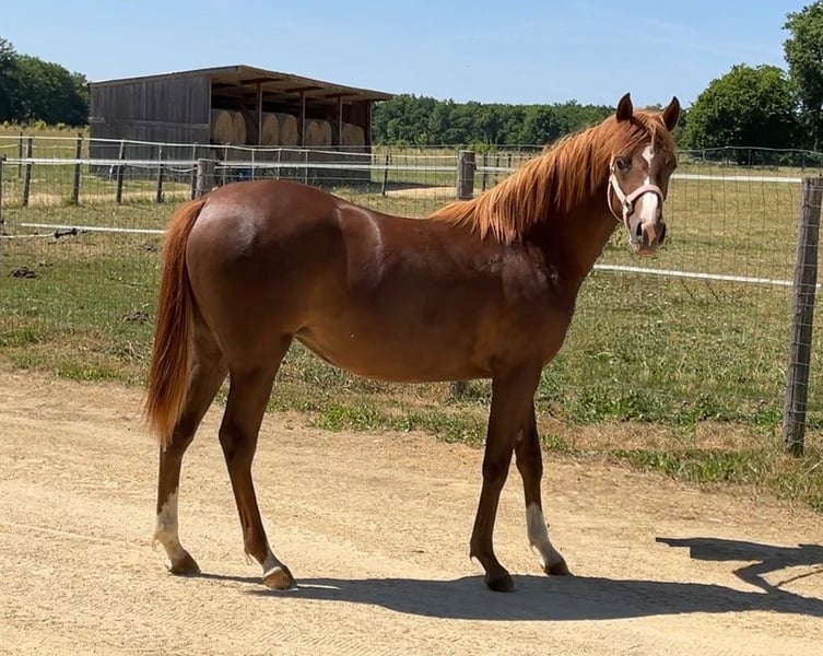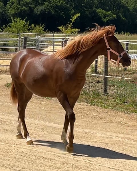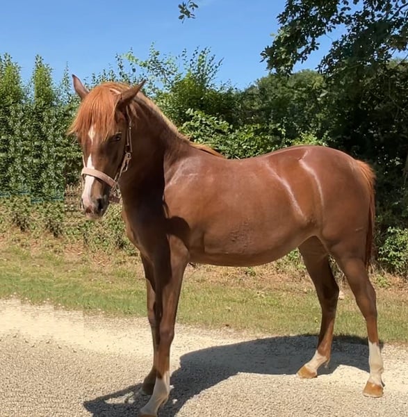 Born in June 2024, OR is a lovely little chestnut Hispano-Arabian model with three high white stockings. 75% Arabian, she shares with her mother an Arabian type and gaits. With a rather compact and round morphology, Or shows lightness and suppleness in her movements. Lively and independent but balanced, she will be versatile, and her strong back predisposes her to both leisure and sports activities. Or will measure around 1.47 m (Pony D). Her price evolves with age and progress in training. The foals are all handled, vaccinated, dewormed, and supplemented. They are raised in groups and especially weaned late around 10 or 11 months for balance. Several other horses are available for sale at the breeding farm, feel free to check the website of "Haras du Gremillon" and contact via SMS for more information.
