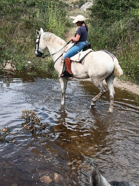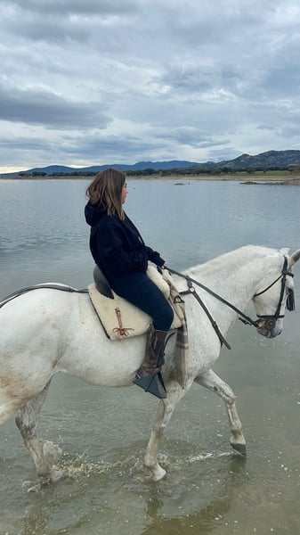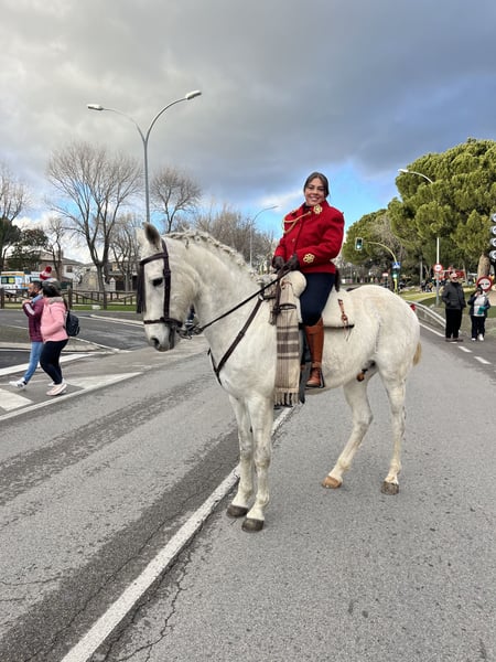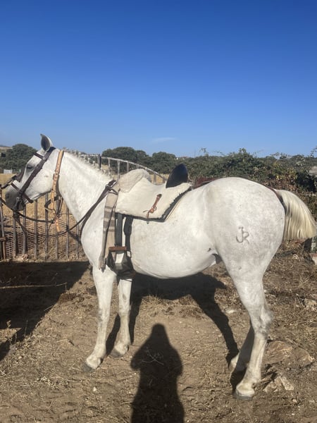 Caballo totalmente manso, castrado, vale para escuela, pero si le pides más tiene mucho que dar. Ha ido a romerías, encierros, cabalgatas de reyes. No se asusta de nada y no tiene maldad ninguna actualmente, le montan muchas niñas de escuela.