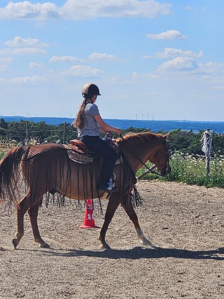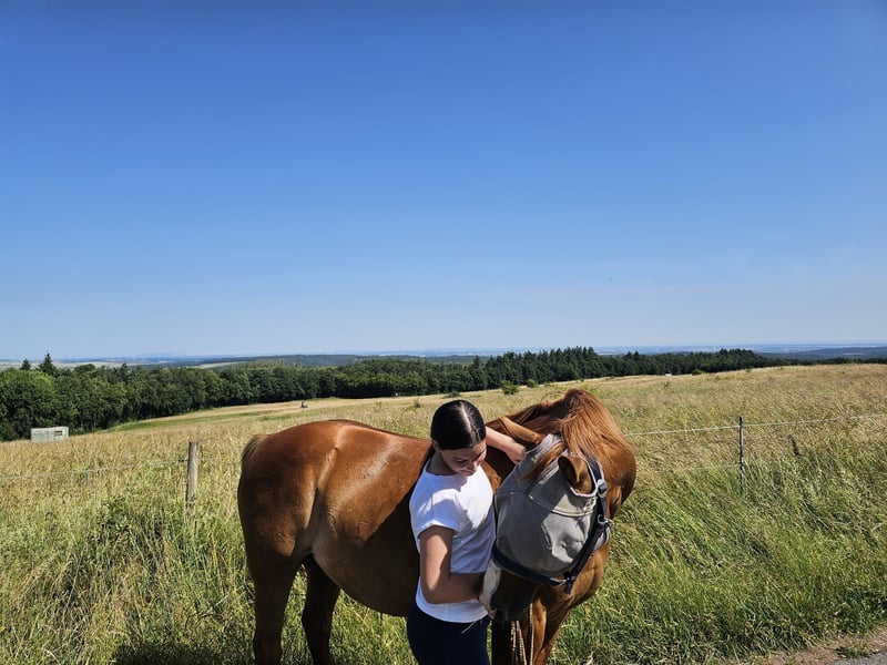 Ich bin Mia, 13 Jahre alt und bin 1,65cm groß und wiege 65kg. Ich suche eine brave Reitbeteiligung die nicht größer als 1,60cm groß ist. Ich reite seit 7 Jahren und nehme weiterhin ein mal die Woche Reitunterricht. Ich würde aber gerne etwas mehr mit Pferden machen. Ich reite Freizeit aber ich mache auch auf dem Reitplatz einige Gymnastik/Dressur Übungen. Am Springreiten bin ich auch interessiert, bin da aber leider noch nicht so Fortgeschritten bzw. Anfänger, woran ich aber gerne arbeiten würde. Zur Zeit reite ich Western, beherrsche aber auch die englische Reitweise. Ich bin Sattelfest und habe keine Angst vor Pferden die mal etwas mehr Power haben. Ich kann auch Longieren und Bodenarbeit machen, oder einfach mal nur kuscheln und putzen. Beim Ausmisten, füttern, etc. kann ich natürlich auch gerne helfen. Ob Wallach oder Stute ist mir ganz egal hauptsache ein treuer Begleiter mit dem man einfach Spaß haben kann. Ich komme aus Euskirchen und es wäre gut wenn ich maximal 15Km weit fahren müsste, da ich von meiner Mutter/ meinem Vater begleitet werden müsste. Ich würde gerne 2x die Woche vorbeikommen. Ich würde mich freuen wenn ich jemanden finde der/die freundlich ist und alles zwischen uns passt. Bei Interesse gerne melden: +49 177 2917110