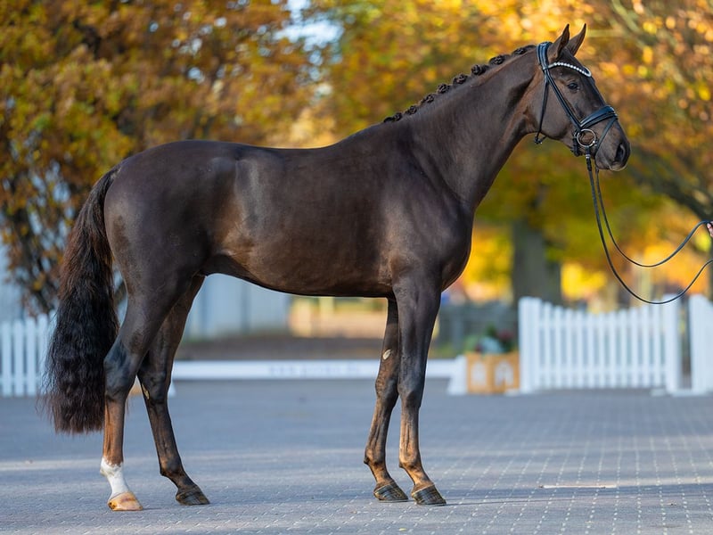 Thiago/Rassolini/Benvenuto Dieser hochmoderne, langbeinige Dunkelfuchs glänzt mit 3 herausragenden Grundgangarten. Stetig im Bergauf, enorm aktiv mit viel Antritt und exaltiertem Bewegungsablauf bringt er die Qualität für das große Viereck mit. Eine Dressurofferte, die ihresgleichen sucht! Vater Thiago verbucht internationale Siege und Platzierungen auf Grand-Prix-Niveau auf seinem Konto und wurde aufgrund seiner Erfolge in das Olympiakader berufen. Erfolgsdaten: V: 14TT dressurbet. Endnote 8,08; sportprüfung Schwerpunkt Dressur i + II 8,08 bzw. 7,90; DPF L siegr./DRE intern. GP CDI5*-Niveau siegr./Sieger Qualifikation Nürnberger Burgpokal Mannheim 2021; lt. FN 2 gekörte Söhne M: MM: 2 sporterfolgr. NK: Uphoria (v. Uthopia) RPF/SPR A* siegr./DPF A erfolgr., Don Karma (v. Don Nobless) DRE L** (USA) siegr. Hannoveraner Stutenstamm 1192804 (Spielkind) gekörte Hengste: Autocrat (v. Aalborg) erfolgr. Springpferde: Wales 3 (v. Waidmannsdank xx) SPR 140cm erfolgr., Goehte (v. Goetz) SPR 140cm erfolgr. erfolgr. Dressurpferde: Wind Dream (v. Waidmannsdank xx) DRE S* erfolgr., Rotspon 5 (v. Rotspon) DRE IM I erfolgr., Benise (v. Breitling W) DRE GP (USA) erfolgr., Brioso (v. Benetton Dream) DRE intern. IM I/DRE intern. Junioren-Tour erfolgr., Tramontana Tiger Feet (v. Grey Flanell) DRE intern. GP erfolgr. erfolgr. Vielseitigkeitspferde: Graf Reinette (v. Grafenstolz/T.) Viels. intern. CCI2* erfolgr., Gretchen V (v. Grafenstolz/T.) Viels. intern. CCI2*-L erfolgr. https://horse24.com/de/auctions/details/5-mecklenburger-koertage-online-auktion-454 Ansprechpartner: Jannes Sonnenberg 01705417431